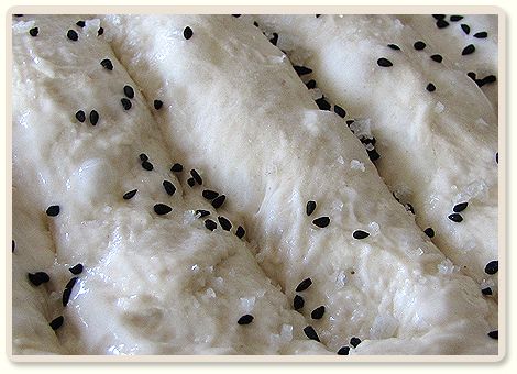 מניחים את הכיכר על מרדה או תבנית המכוסה בנייר אפייה. בעזרת קצה האצבע, או כל כלי בעל קצה מעוגל, יוצרים "עמקים" לאורך הכיכר, על ידי לחיצה חוזרת ונשנית לאורך קו מסוים. מורחים את הרביכה על הכיכר, מפזרים עליה מעט קצח, שומשום ומלח גס ומכניסים לתנור.