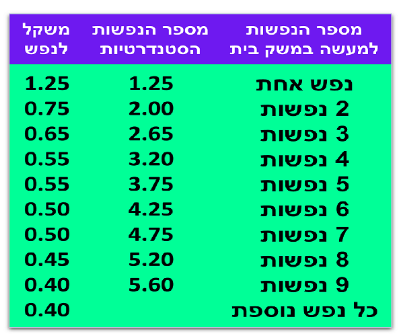 השנה אין ניקוד על ילדים ונקבע שחלוקת ההכנסה הממוצעת תתחלק לפי "מספר הנפשות הסטנדרטי" סוג של "הגבלת ילודה" שככל שיש יותר ילדים זה לא מוסיף הרבה (כלומר במכנה נוסיף 0.65 ועל הילד הבא רק 0.55 וכך יורד ויורד )