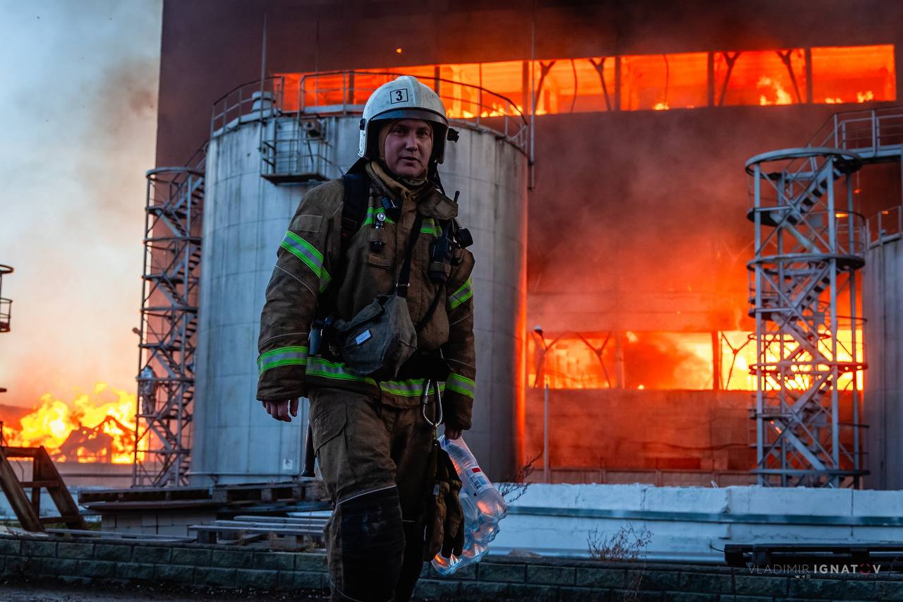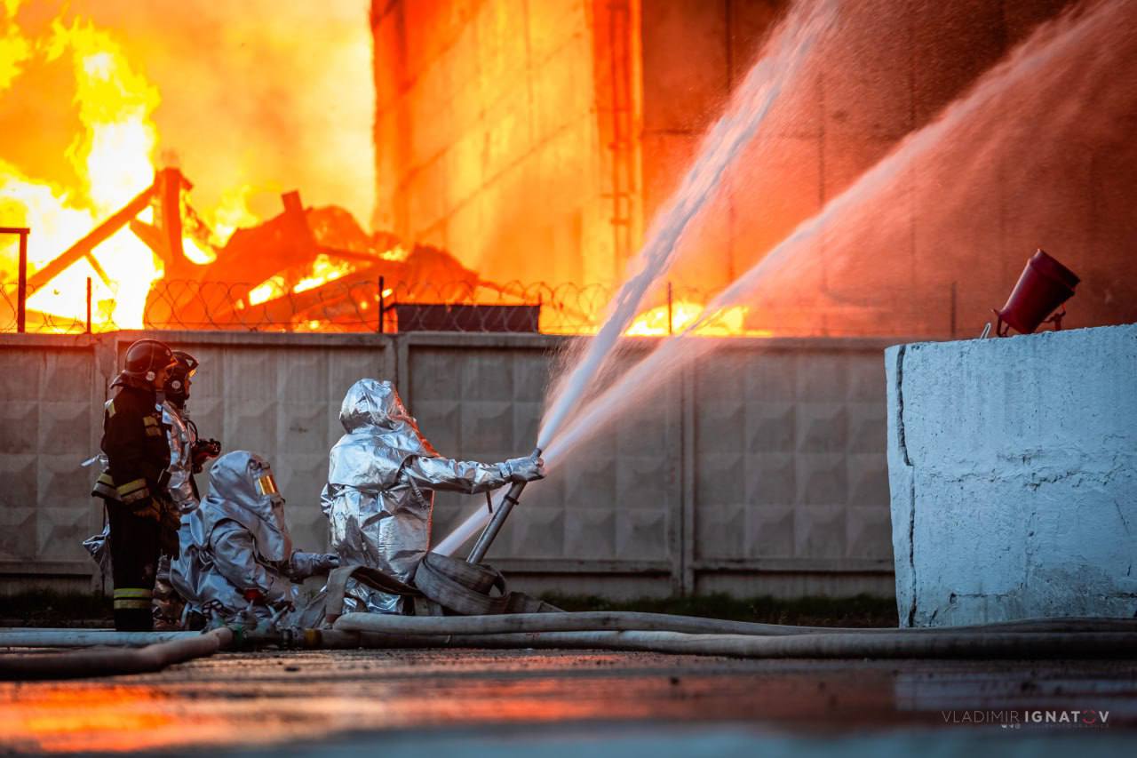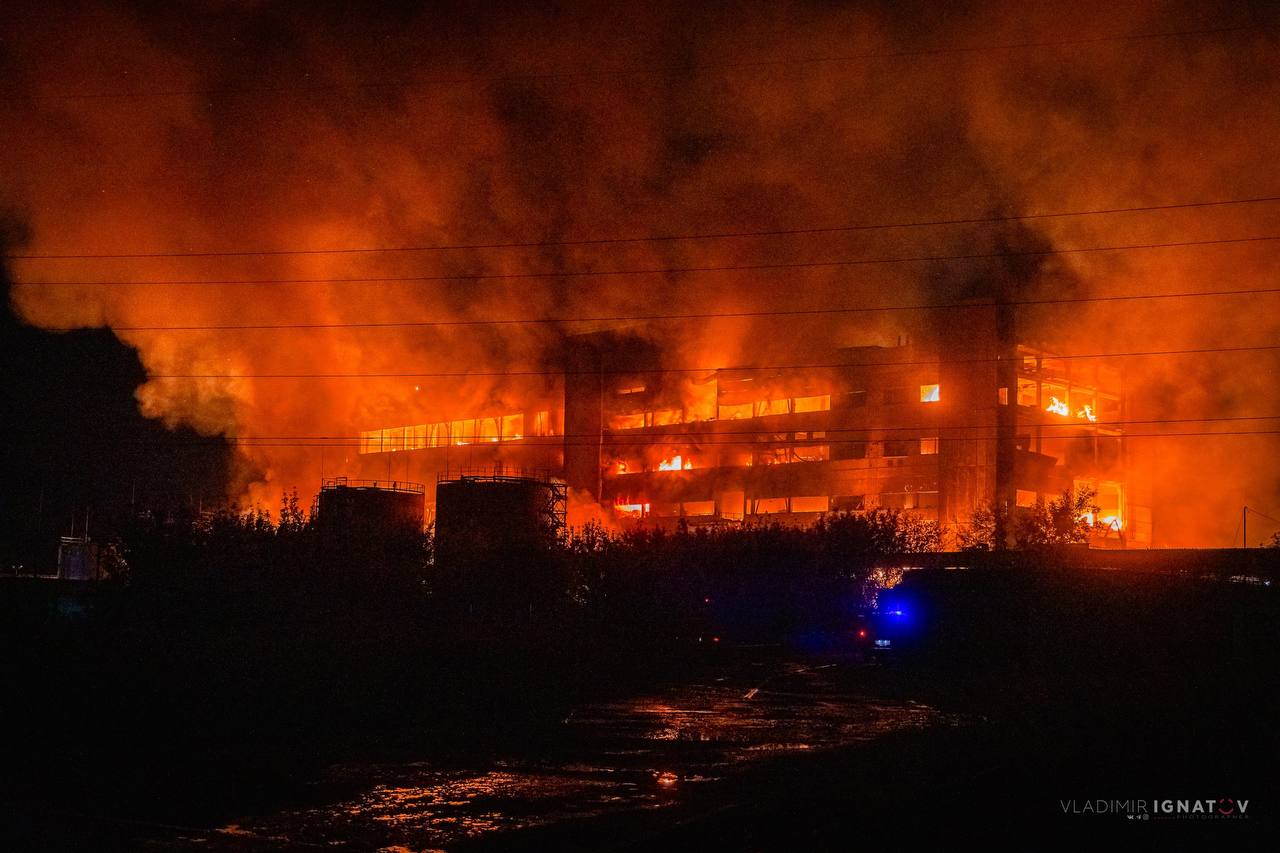 שריפה גדולה בוערת במפעל בבורנול, רוסיה.