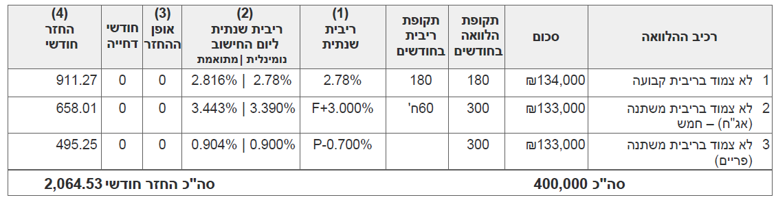 ההלוואה מיועדת לרכישת דירה להשקעה ואיתה לשלם את המשכנתארביעית, אין שום אפשרות לבדוק ככה מקצועית - אין לי את מספר השנים המדוייק לכל מסלול, לא ידוע לי מה מוצמד מדד ומה לא, אין לי את המשכנתה הקודמת שלכם כדי לדעת מה תמונת המצב הכללית שלכם, מה סוג ההכנסה שלכם - כדי לדעת כמה מותר לסכן אותכם ספציפית עם מדד ועליית ריבית ואיזה.. האם יש לכם קרנות / כספים שייפרעו לכם בעתיד, האם יש לכם אפשרות להלוואות ממקורות אחרים [ע"ח השתלמות/פנסיה/ממשפחה ועוד]
