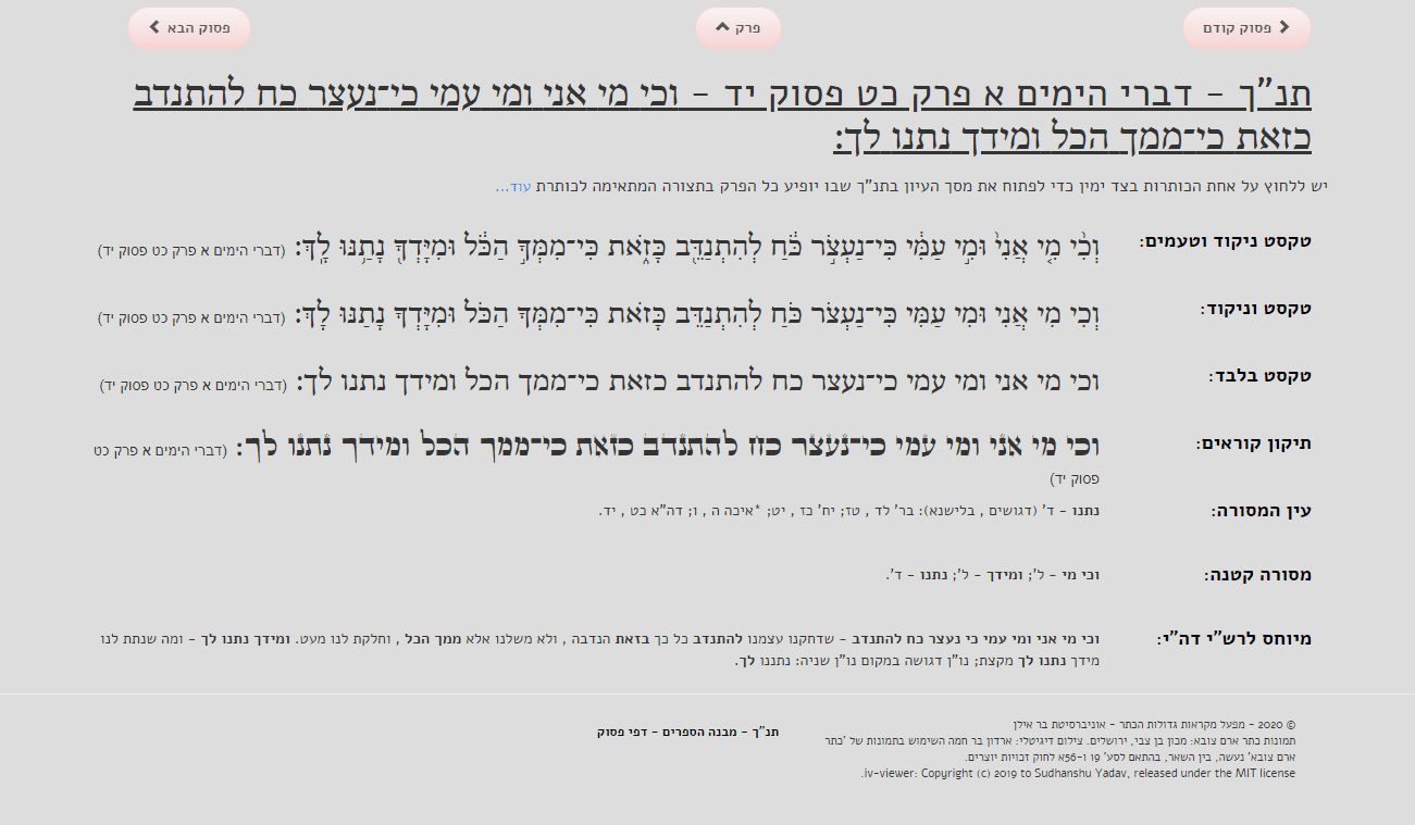 אלְדָוִד אֵלֶיךָ יי נַפְשִׁי אֶשָּׂא:באֱלֹהַי בְּךָ בָטַחְתִּי אַל אֵבוֹשָׁה אַל יַעַלְצוּ אֹיְבַי לִי:גגַּם כָּל קוֶֹיךָ לֹא יֵבֹשׁוּ יֵבֹשׁוּ הַבּוֹגְדִים רֵיקָם:דדְּרָכֶיךָ יי הוֹדִיעֵנִי אֹרְחוֹתֶיךָ לַמְּדֵנִי:ההַדְרִיכֵנִי בַאֲמִתֶּךָ וְלַמְּדֵנִי כִּי אַתָּה אֱלֹהֵי יִשְׁעִי אוֹתְךָ קִוִּיתִי כָּל הַיּוֹם:וזְכֹר רַחֲמֶיךָ יי וַחֲסָדֶיךָ כִּי מֵעוֹלָם הֵמָּה:זחַטֹּאות נְעוּרַי וּפְשָׁעַי אַל תִּזְכֹּר כְּחַסְדְּךָ זְכָר לִי אַתָּה לְמַעַן טוּבְךָ יי:חטוֹב וְיָשָׁר יי עַל כֵּן יוֹרֶה חַטָּאִים בַּדָּרֶךְ:טיַדְרֵךְ עֲנָוִים בַּמִּשְׁפָּט וִילַמֵּד עֲנָוִים דַּרְכּוֹ:יכָּל אָרְחוֹת יי חֶסֶד וֶאֱמֶת לְנֹצְרֵי בְרִיתוֹ וְעֵדֹתָיו:יאלְמַעַן שִׁמְךָ יי וְסָלַחְתָּ לַעֲוֹנִי כִּי רַב הוּא:יבמִי זֶה הָאִישׁ יְרֵא יי יוֹרֶנּוּ בְּדֶרֶךְ יִבְחָר:יגנַפְשׁוֹ בְּטוֹב תָּלִין וְזַרְעוֹ יִירַשׁ אָרֶץ:ידסוֹד יי לִירֵאָיו וּבְרִיתוֹ לְהוֹדִיעָם:טועֵינַי תָּמִיד אֶל יי כִּי הוּא יוֹצִיא מֵרֶשֶׁת רַגְלָי:טזפְּנֵה אֵלַי וְחָנֵּנִי כִּי יָחִיד וְעָנִי אָנִי:יזצָרוֹת לְבָבִי הִרְחִיבוּ מִמְּצוּקוֹתַי הוֹצִיאֵנִי:יחרְאֵה עָנְיִי וַעֲמָלִי וְשָׂא לְכָל חַטֹּאותָי:יטרְאֵה אוֹיְבַי כִּי רָבּוּ וְשִׂנְאַת חָמָס שְׂנֵאוּנִי:כשָׁמְרָה נַפְשִׁי וְהַצִּילֵנִי אַל אֵבוֹשׁ כִּי חָסִיתִי בָךְ:כאתֹּם וָיֹשֶׁר יִצְּרוּנִי כִּי קִוִּיתִיךָ:כבפְּדֵה אֱלֹהִים אֶת יִשְׂרָאֵל מִכֹּל צָרוֹתָיו: