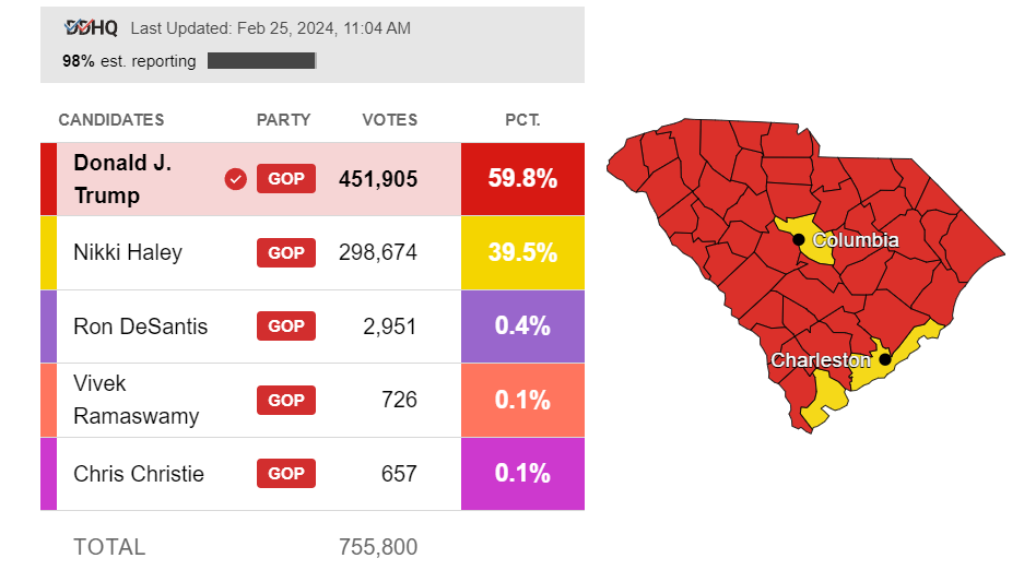 הנשיא לשעבר רשם הלילה ניצחון ברור על ניקי היילי בפריימריז של המפלגה הרפובליקנית בדרום קרוליינה – המדינה הביתית שלה שם כיהנה בעבר כמושלת.