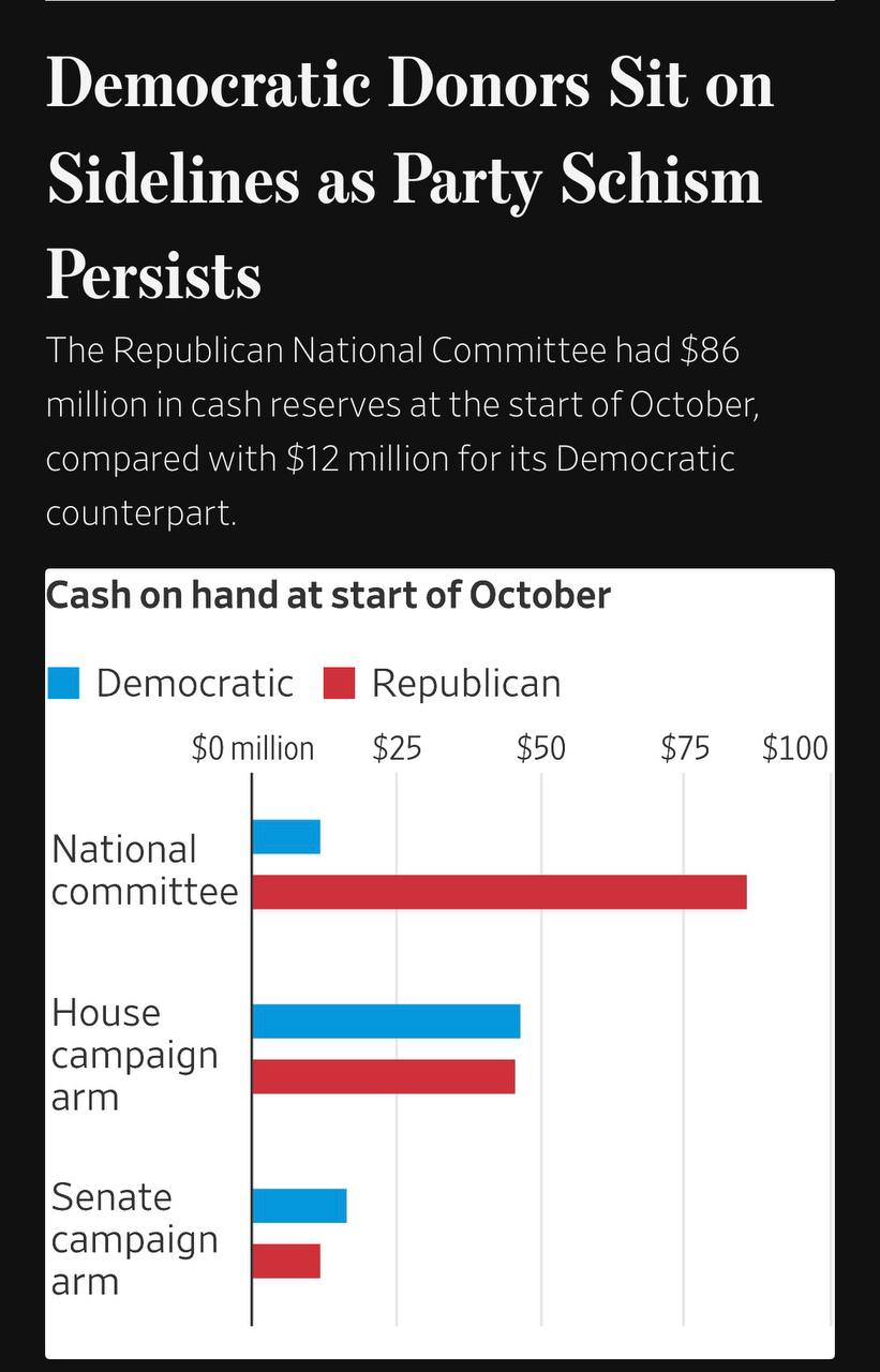 זה נתון דיי מדהים בהיתלשב זה שקמפיין האריס הצליח לגייס למעלה ממיליארד דולר לפני שנה. צריך עוד לחכות, אבל נראה שהממסד הפוליטי של המפלגה, זה שמחובר לצינורות המזומנים, הולך ומאבד את מקומו לטובת תומכי חמאס ושונאי משטרה.
