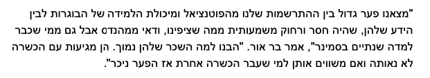 אבל כמה מפתיע , סביר להניח שלא מעניין אותו בכלל אם חלק מהבנות תלמדנה בסמינר X או בסמינר Y וממש לא משנה לו אם תעשינה תואר או לא - הוא רוצה עובדים טובים כדי להעלות את הרווח של החברה. ומבחינתו יש פער בין עובדים עם תואר לכאלו שאין להם.