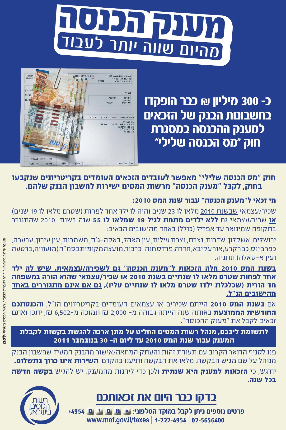 כדי לקבל את המענק בעבור שנת המס 2010 עליך להגיש את התביעה עד ל- 30 בספטמבר 2011