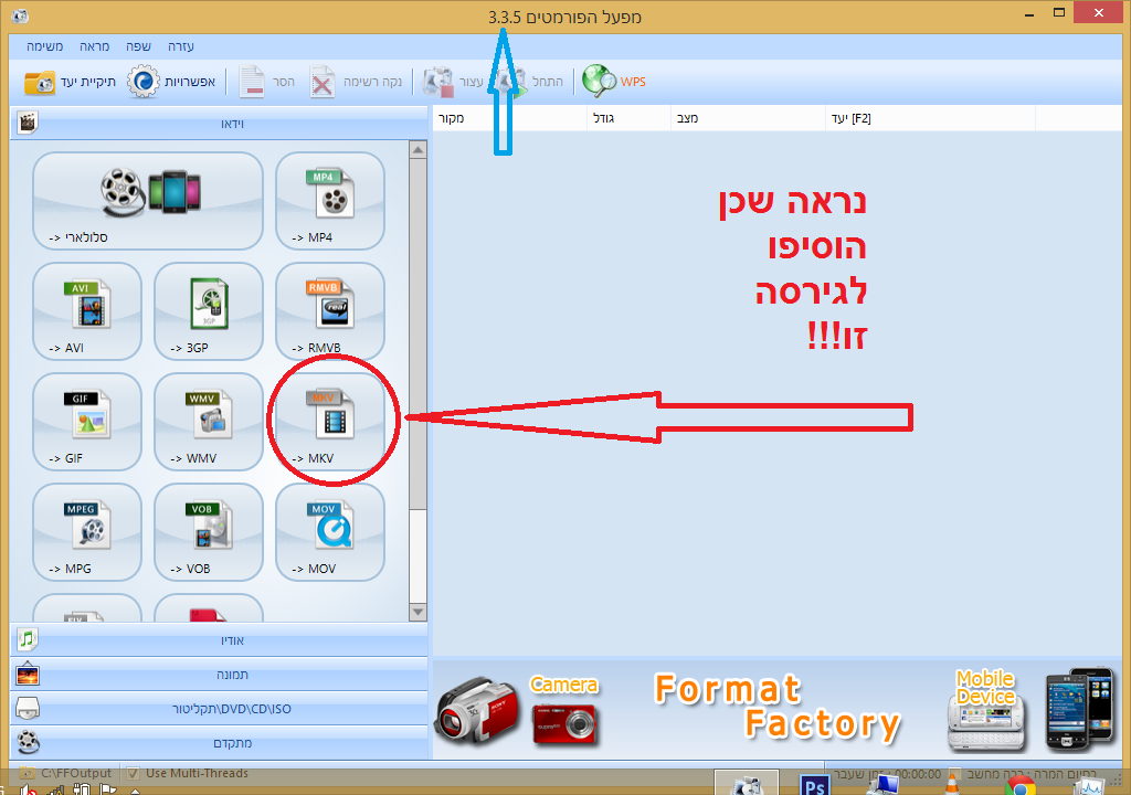 לאחר ההתקנה והרצה נקבל את החלון הראשי ובוא כל אפשריות הפורמטים.