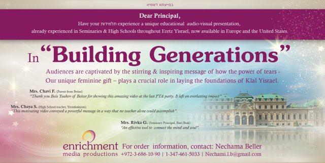 המצגת "בנייה לדורות" = Building Generations מבוקשת ביותר לערבי הורים, סמינרים, השתלמויות, תיכונים, מתנ"סים, אסיפות צוות ועוד.