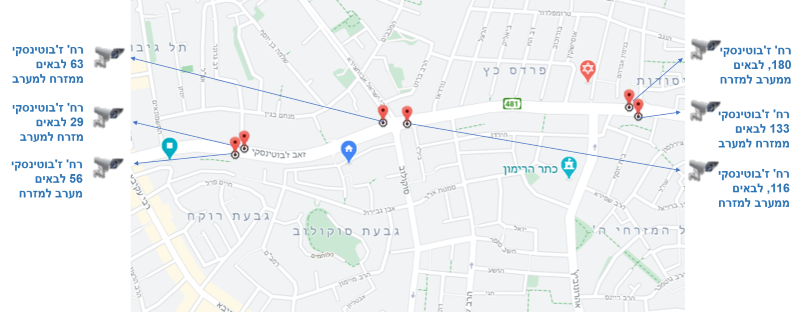 האכיפה מתבצעת באמצעות מצלמות נייחות הממוקמות ברחובות כהנמן ואהרונוביץ', להלן מיקומי המצלמות: