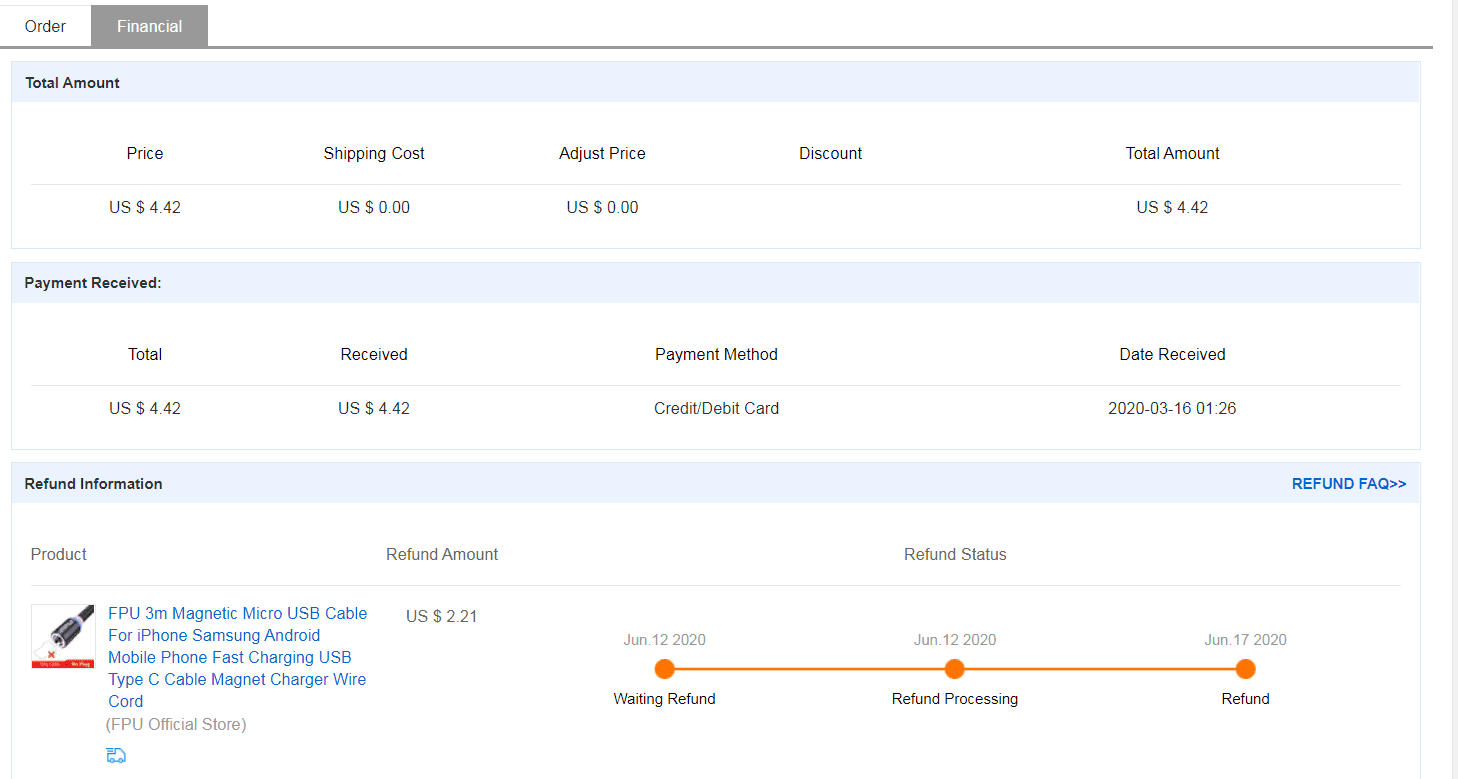 אחרי שיש הכרעה בסכסוך, אפשר לראות את זה בטאב Financial של ההזמנה הספציפית.