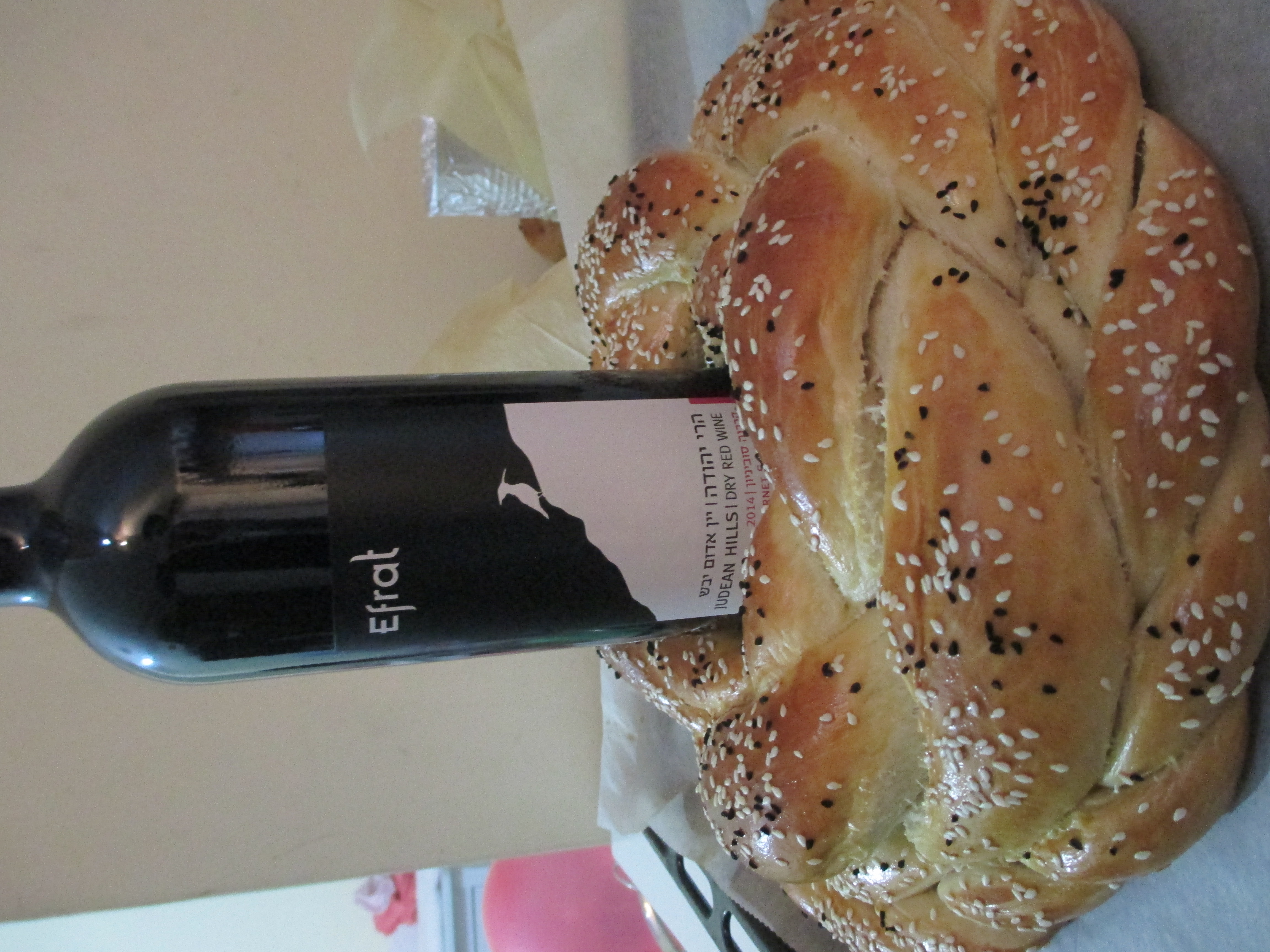 חלה עגולה עם בקבוק יין באמצע