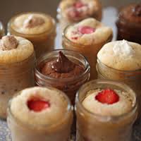 עוגה בצנצנת. אפשר לאפות ישר בצנצנת או לאפות עוגה כרגיל ואז לחתוך בקורצן שכבות בגודל מתאים עם קרם/קצפת.פירות כיד הדמיון