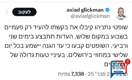 כזכור, בית המשפט החליט לקבל את בקשתו של נתניהו חרף התנגדות הפרקליטות, ולצמצם את ימי העדות ליומיים בשבוע בחודשיים הקרובים כשבמקום יום עדותו של ראש הממשלה יובאו עדי הגנה.