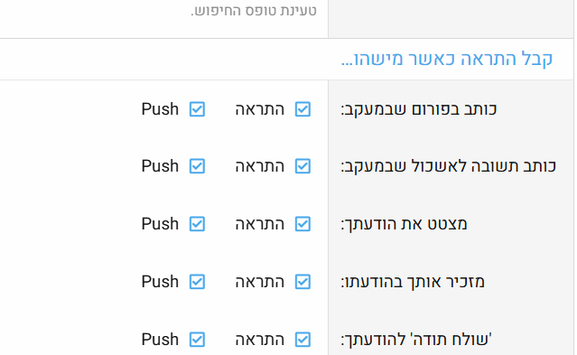 שם תוכלו לבחור מתי ואיפה תתקבלנה התראות- בתיוגכם ע"י משתמשים, בהתקבל תגובה לפוסט שפרסמתם ועוד