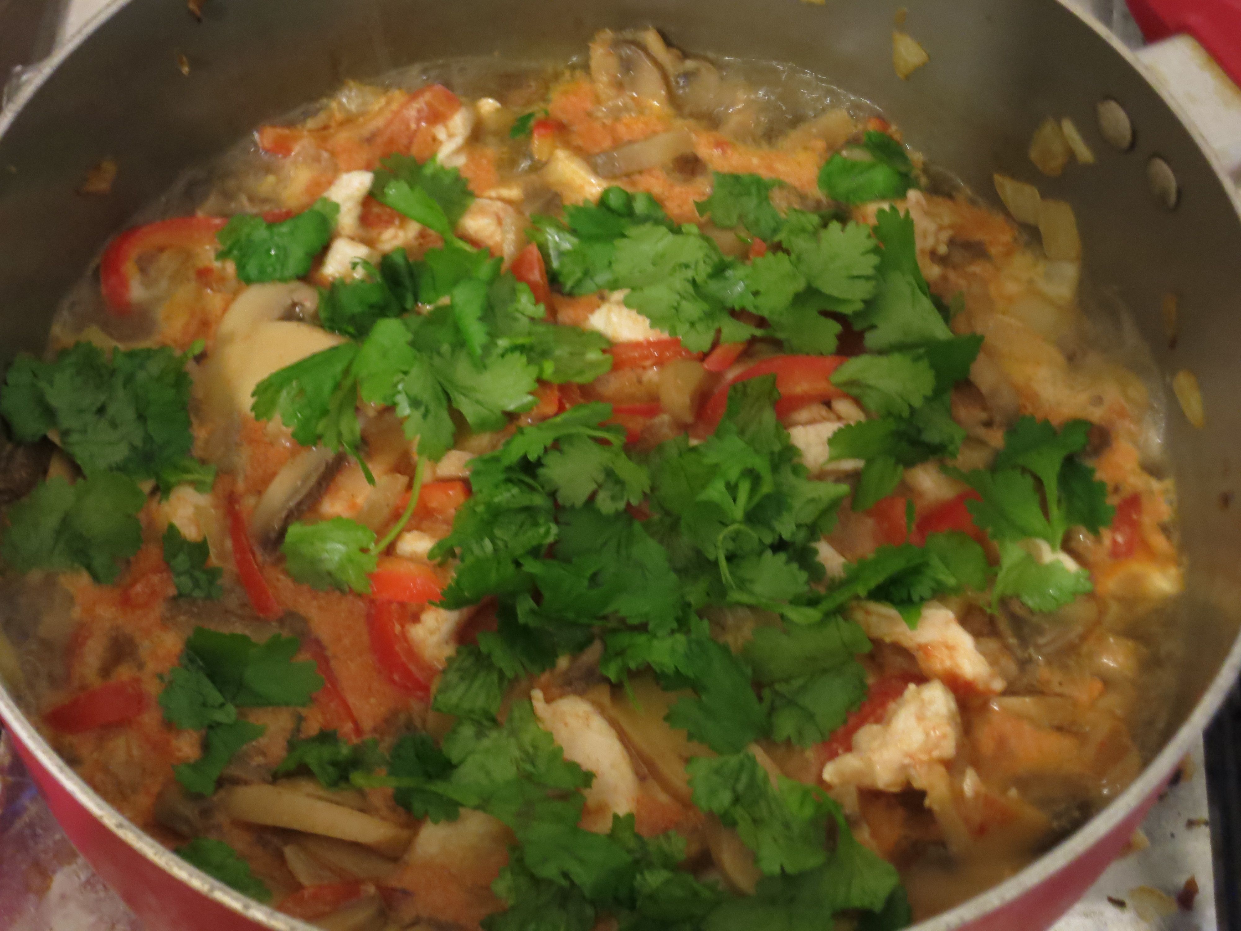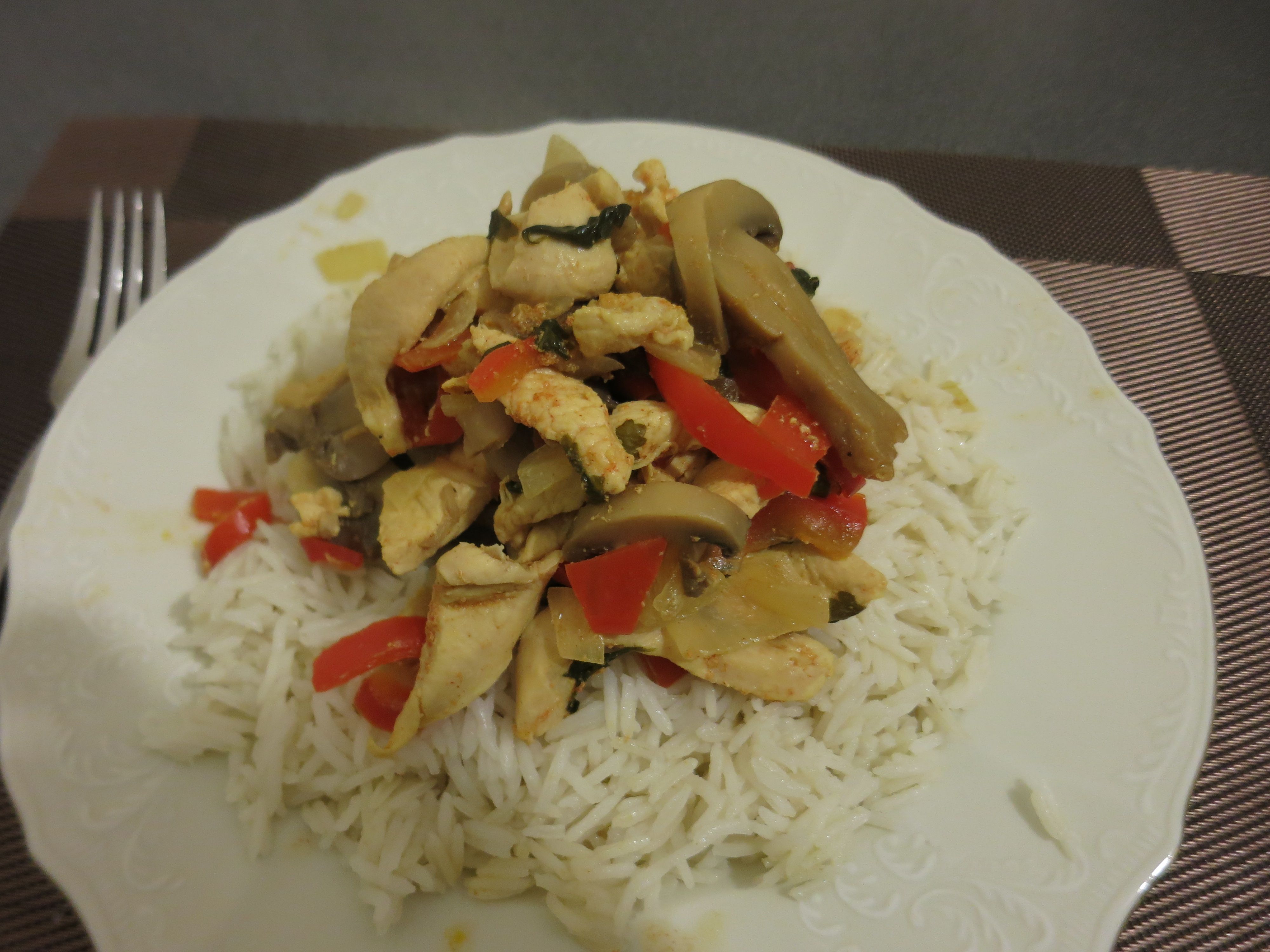 בסיר רחב ושטוח מטגנים את הבצל עד להזהבה, מוסיפים את הפלפל אדום ומטגנים מספר דקות, מוסיפים את רצועות העוף עד שהן מלבינות.