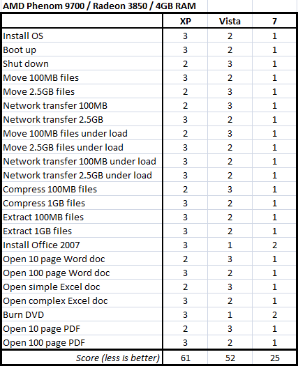 יש בדיקה מאוד מעניינת של אדריאן קינגסלי-יוז (הגורו של החומרה, יש לו בלוג מאוד פופולרי ב ZD האתר של PCMAG) שעשה השוואה מקיפה ביותר על הבטא-1 של וינ7 מול ויסטה ו XP SP3, במישור המהירות, ווינ7 יצאה מנצחת בגדול הרבה לפני XP וממילא גם לפני ויסטה.