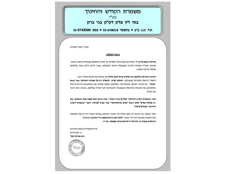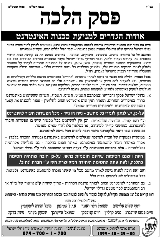ומחובתי לציין, שהעמידו מומחה גדול כמשגיח תמידי שיעמוד ויפקח על כל תהלוכות הסינון, וכל מי שח"ו תעלה בידו איזה דבר שאיננו ראוי לציבור החרדי, יודיע מיד למשגיח והדבר ייפתר תוך שעות ספורות – והנני מציין שדברינו אינם בגדר הצעה והמלצה אלא בגדר הוראת חובה למי שצריך לכך.