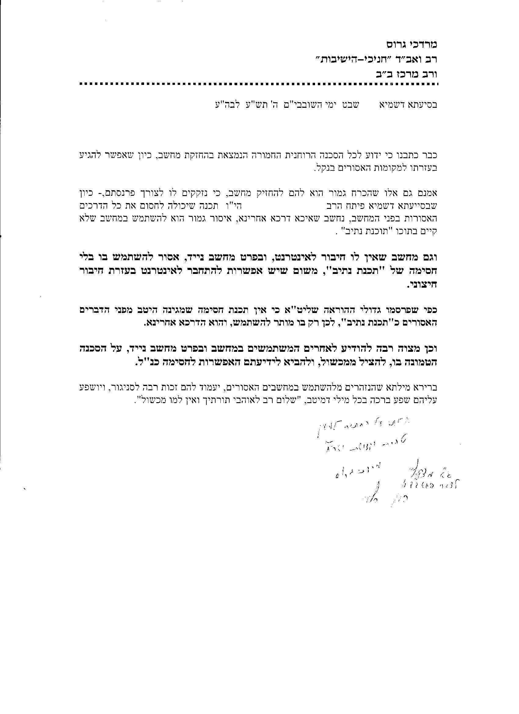 ואין לי שום ספק שמהיום והלאה לא ימצא בד' של אדם חרדי בשום מקום שהוא לא מחשב נייח ולא מחשב נייד שלא תותקן עליו חסימה הנ"ל – ובזכות נקיות מלאכתן מאחיזת הסטרא אחרא וחילותיו, נזכה לפרנסה בכבוד, ותשרה הברכה בכל מעשה ידינו.