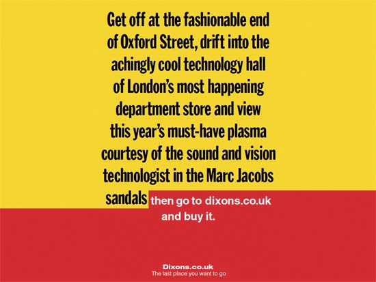 פרסום טוב מתחיל ונגמר קודם כל ברעיון. במקום לנסות לקשקש ולספר סיפורים, דיקסון החליטו לנסות ולעשות משהו באמת חדש - להגיד את האמת ולנצל בצורה הטובה ביותר את כוחו הגדול ביותר של הפרינט, את הכוח של המילה. אין אחד שיקרא את הטקסט ולא יתחבר לתובנה האמיתית העומדת בבסיסה. אל תהיה קורבן לפוזה, למעטפת, למניפולציה. תובנה דומה הוציאה בקיץ האחרון מאות אלפי אנשים לרחובות. Respect to that.