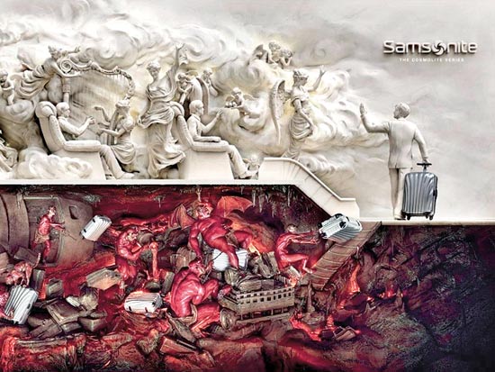 אש, גופרית ותמרות עשן מאיימות על כל המזוודות. אלא אם כן יש לך סמסונייט. רק אז היא בטוחה ומוגנת מפני כל המרעין בישין. אלף הסברים טכניים על החומרים החזקים ועל שכבות המגן שממנה עשויה המזוודה ועל האחריות וכל הבולשיט,לא היו עושים את מה שתמונה, הגובלת באמנות מודרנית, עושה בצורה מרשימה כל כך. אני השתכנעתי. לפני הטיסה הבאה שלי אני קונה לעצמי סמסונייט, ומהר.