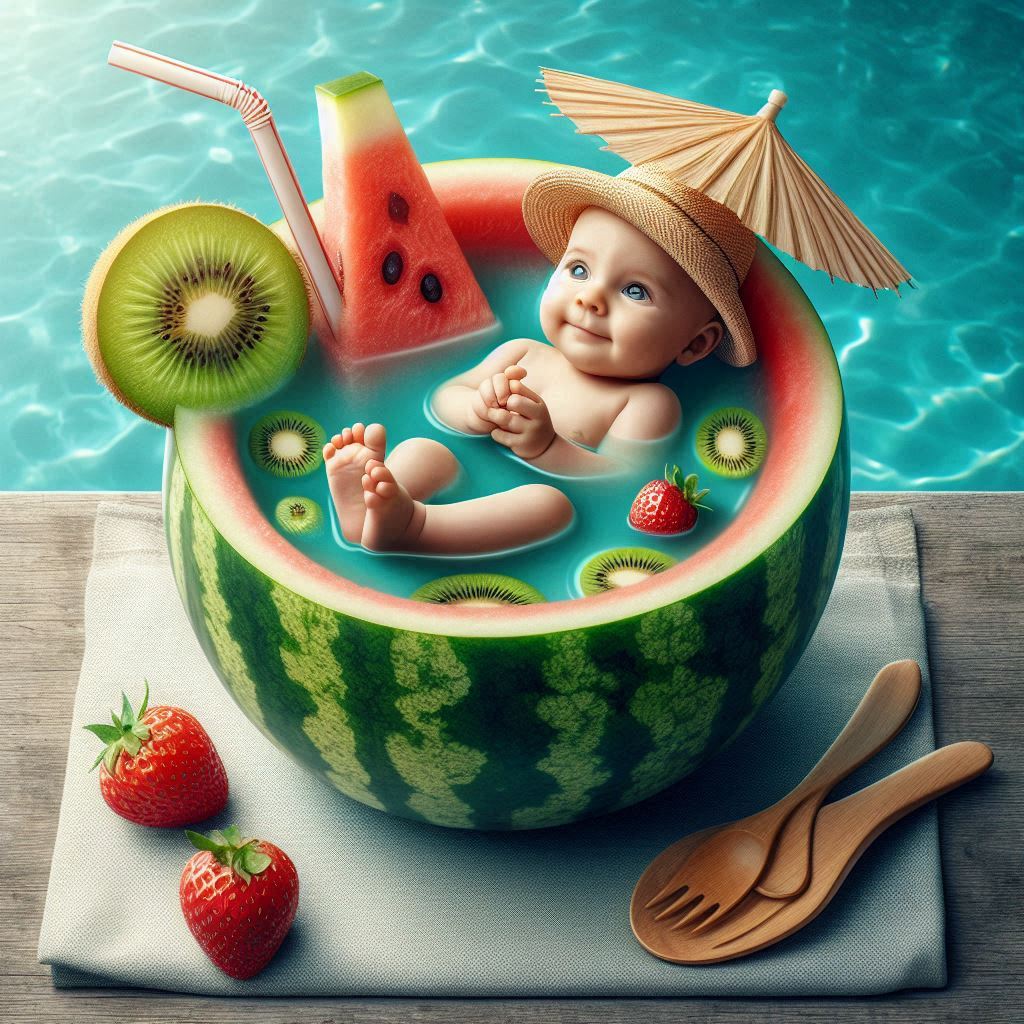 Create an image of a conceptual cocktail and a baby sitting inside, combining vacation elements with fruits (kiwi and watermelon) Photoshop style. The image should be realistic and minimalistic