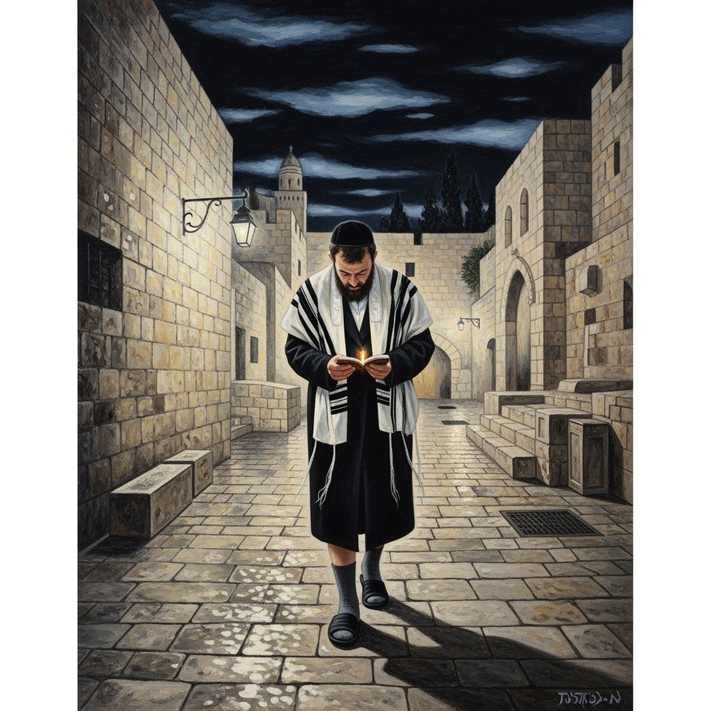 מן הרחוב והבתים שסביבו, ניתן לזהות בבירור שהאיש פוסע ברחובות העיר העתיקה של ירושלים. נעלי הבית שעל רגליו מרמזות כי מדובר ביום תשעה באב, זמן של אבלות. לעומת זאת, העובדה שהוא לובש ציצית מצביעה על כך שהשעה היא כבר עלות השחר. הנר שהוא נושא בידו מעיד כי אין זה יום כיפור