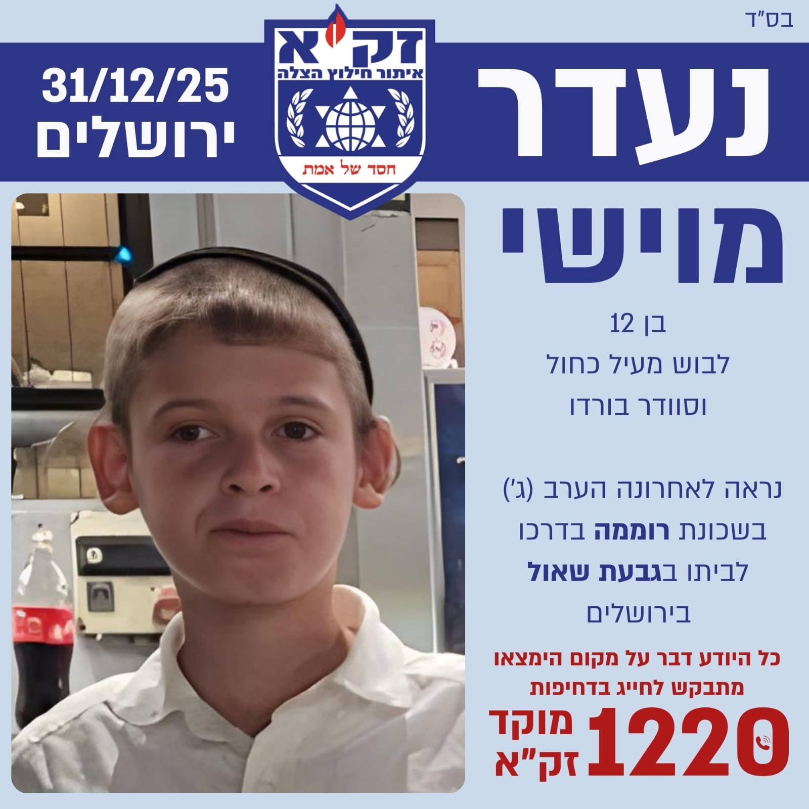 הילד מוישי, בן 12, נעדר מאז השעה 19:00 בירושלים. הילד ללא טלפון נייד, והיעדרותו מעוררת חשש כבד.