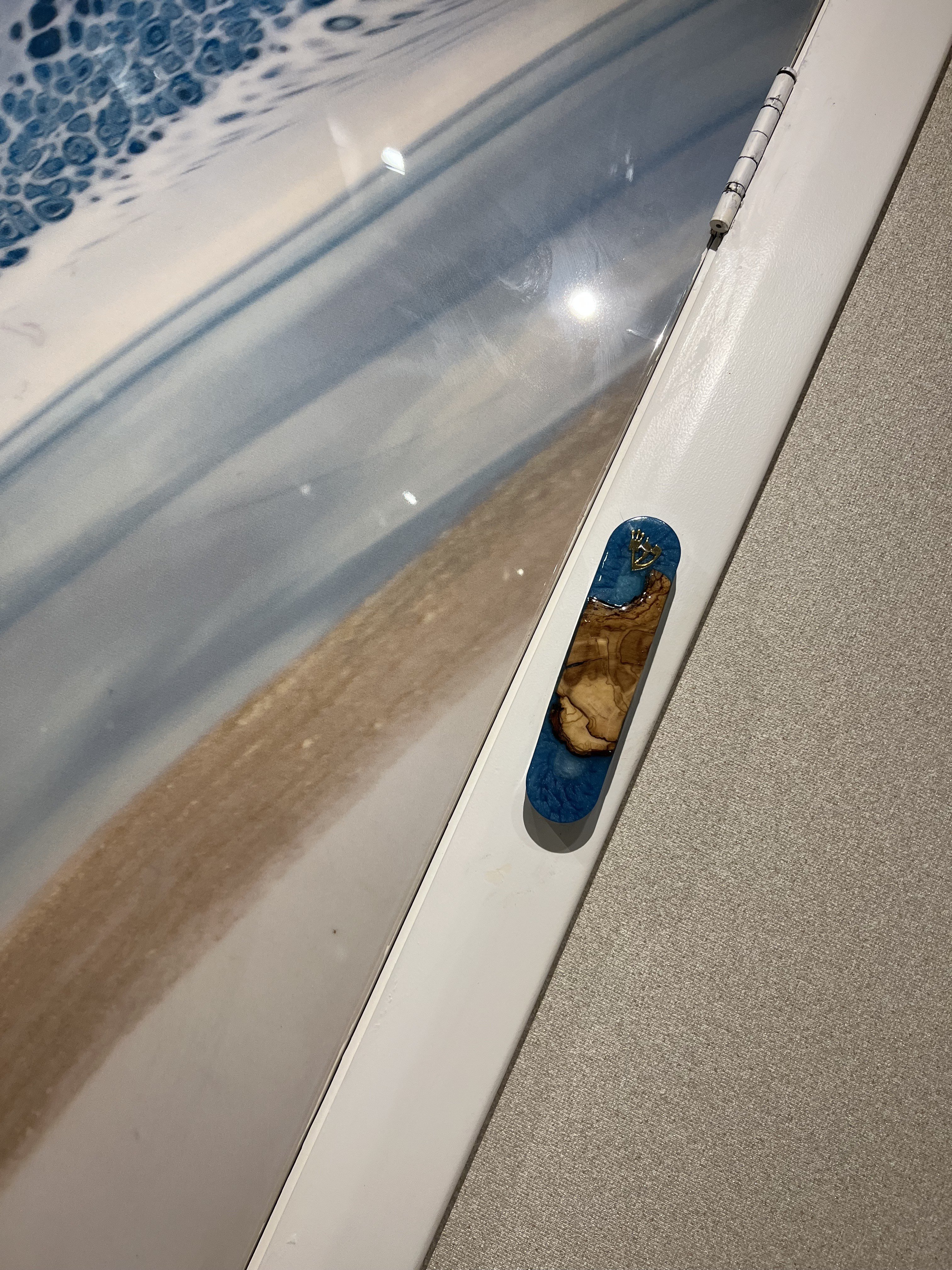 זו טכניקה מגניבה של צבע מיוחד לבן שנקרא לבן אוקיינוס. בנשיפות עם קש או פן או מבער חום מיוחד עושים צורות של גלים על אפוקסי צבוע בגווני טורקיז ותכלת.