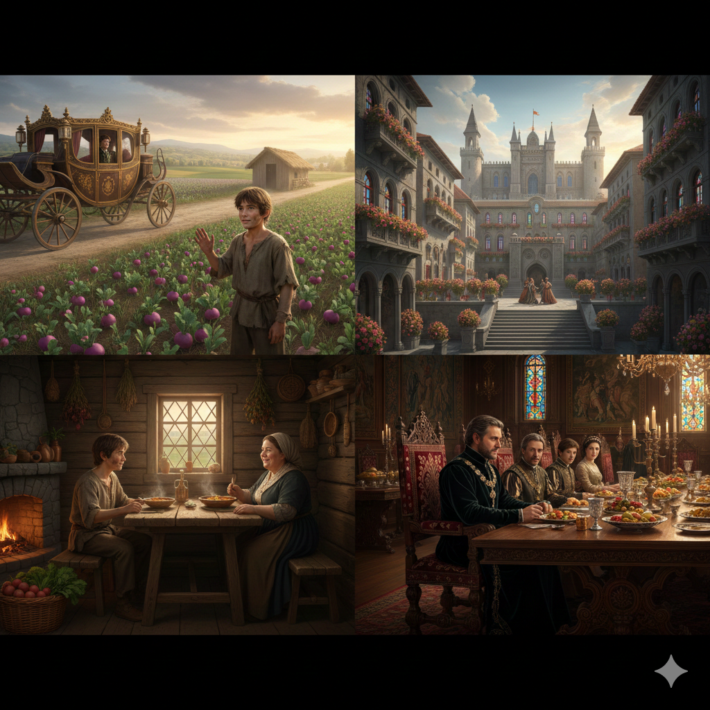 "תסעדו איתנו, אתם אורחי הכבוד", אמר לו הנסיך באצילות אופיינית, מורה למשרת שעמד הכן בצד החדר, להוסיף כלי ארוחה לשליש ולרעייתו.