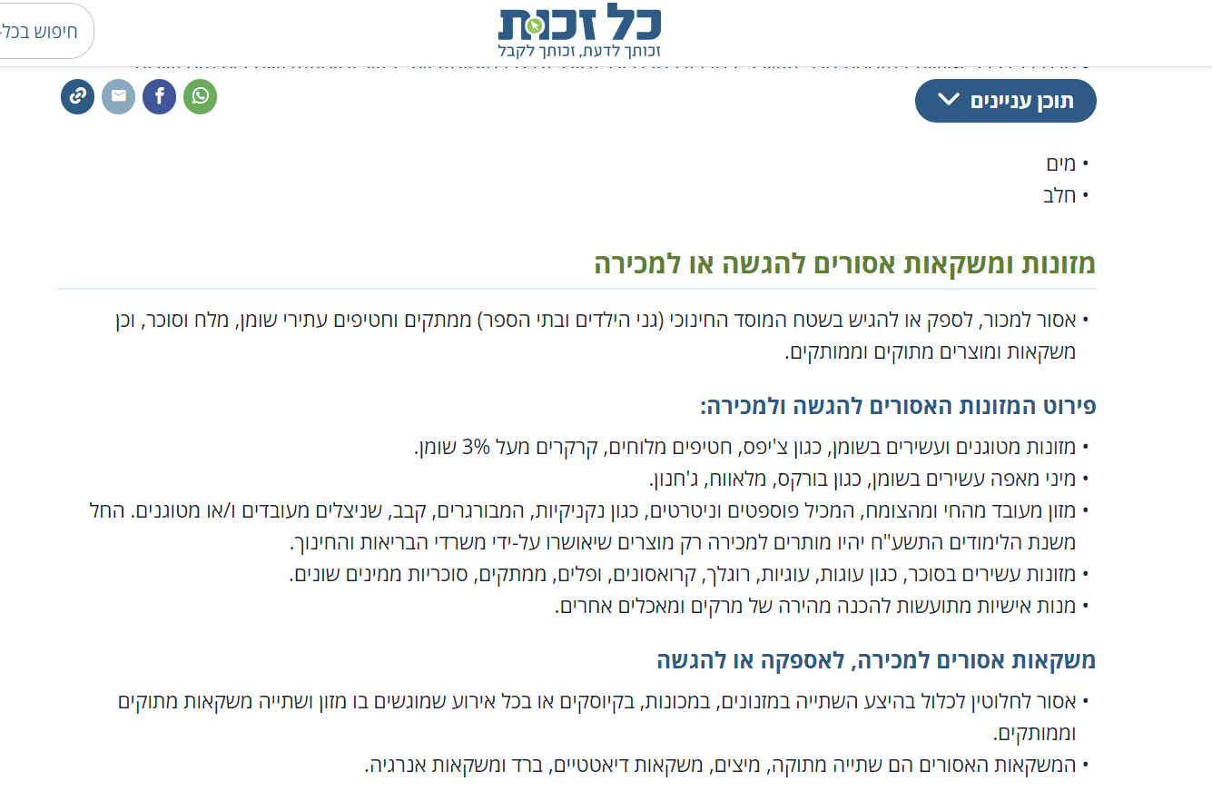 "המשקאות המותרים הם מים וחלב בלבד. יודגש כי אסור לחלוטין לכלול בהיצע השתייה במזנונים, במכונות, בקיוסקים או בכל אירוע שמוגשים בו מזון ושתייה משקאות מתוקים וממותקים."