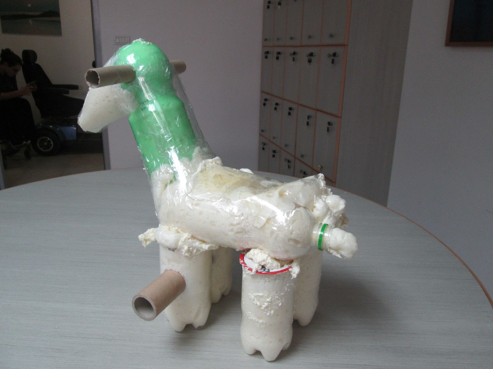 עיצבתי את הסוס מבקבוקים מילאתי אותם בחומר מנפח ועל זה שמתי עיתונים טבולים בדבק טפטים ועל זה את העיסת ניר