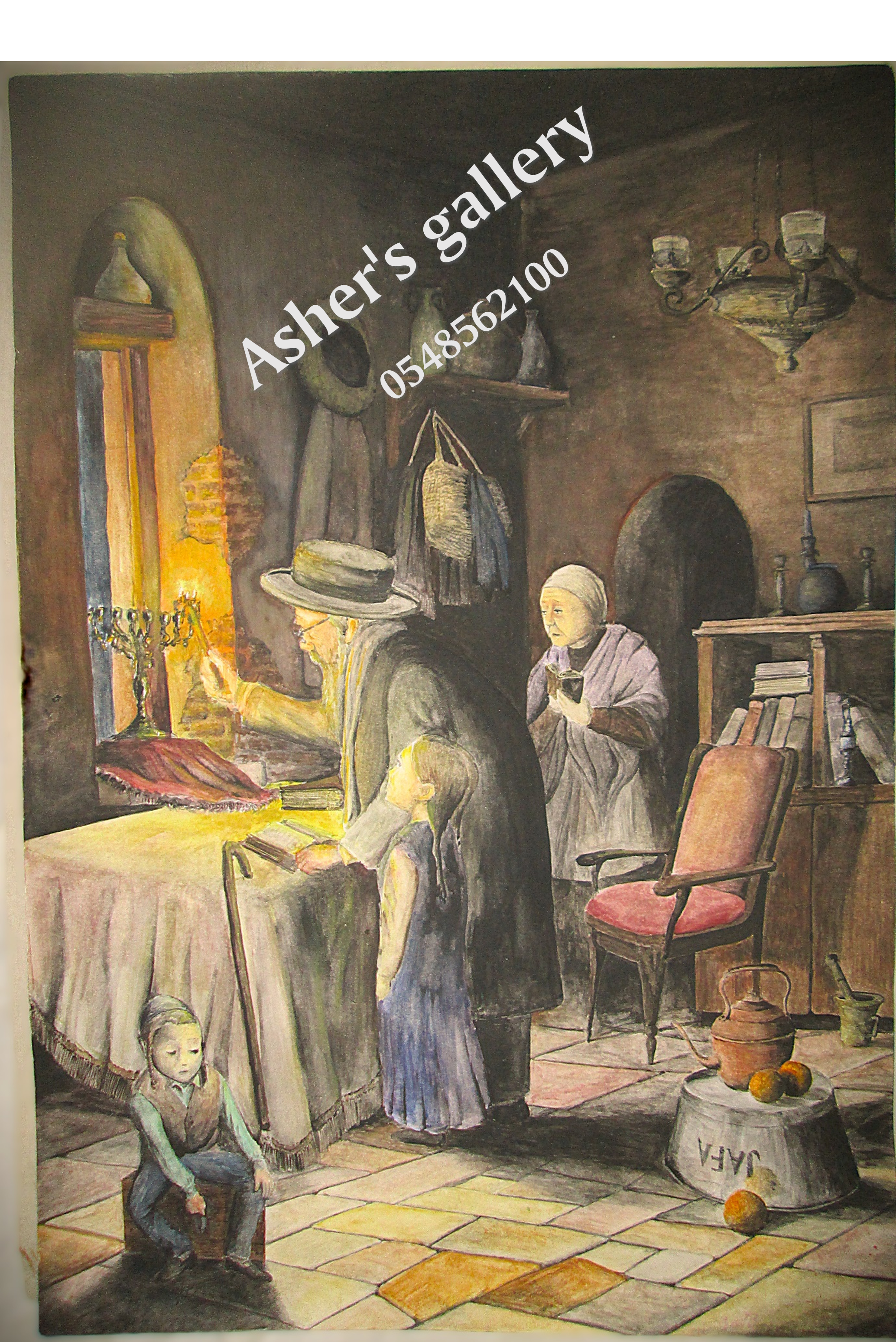 בחנוכה הקודם התחלתי סקיצה בצבעי מים על מנת ליצור לאחר מכן ציור בצבעי שמן. מכיון שהסקיצה הצליחה יותר מדי החלטתי להתמקד בה... העבודה נמשכה שנה שלימה (!) בטכניקה לא שגרתית בצבעי מים, ב"ה עכשיו אפשר לומר שהיה כדאי...