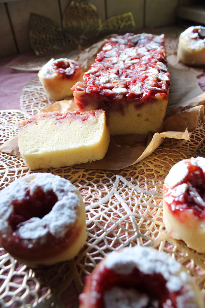 מזלפים מעט רוטב תות למרכז כל מאפינס או מעל לעוגה בשכבה דקה. מפזרים שקדים מולבנים פרוסים