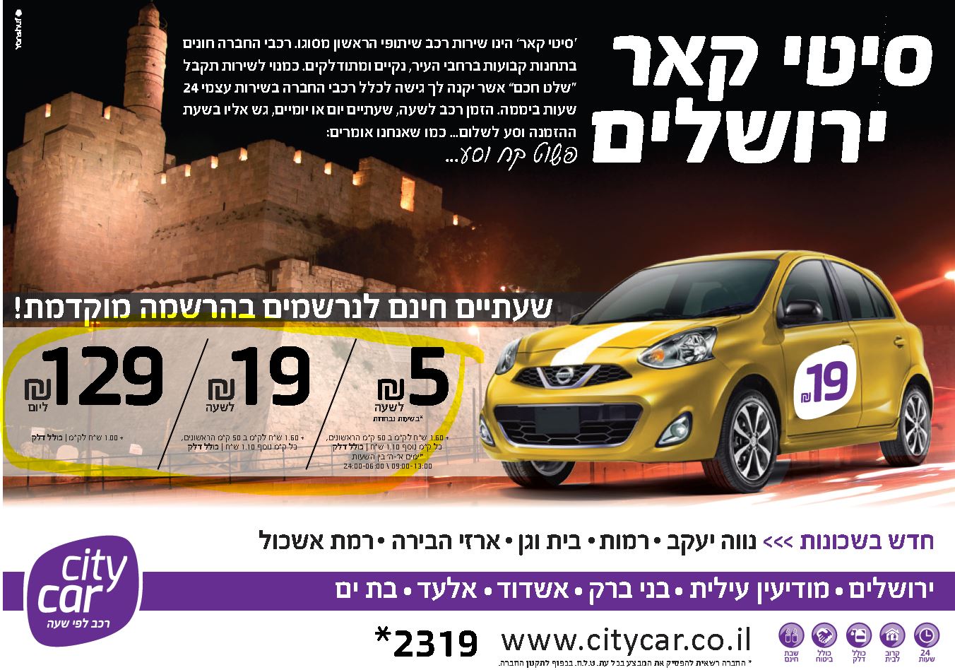 יש לי בעיה עם הפרסומות של סיטי קאר הם כותבים 19 לשעה ובהתחלה מאוד התלהבתי אך לאחר בירור יש דבר שהם אפילו לא טורחים לכתוב בכוכבית שחוץ מזה יש תשלום נוסף לכל קילומטר מהקילומטר הראשון!!! זה לא הטעיה??