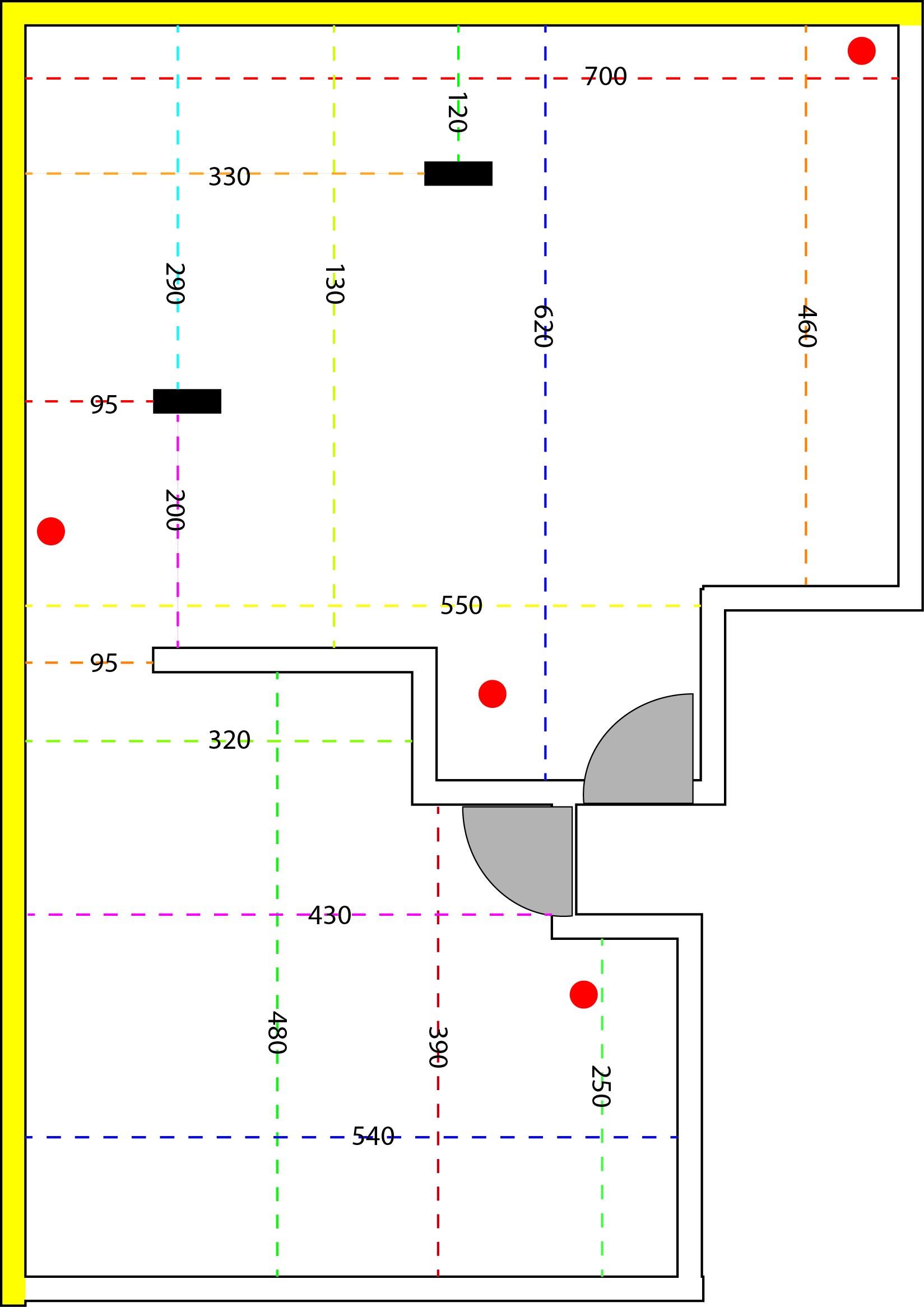 הקירות שמצוינים בתרשים הם קירות שאי אפשר להזיז. הקירות הצהובים הם קירות חיצוניים. העמודים הם המלבנים השחורים. נקודות אינסטלציה מסומנות בעיגולים אדומים אבל הבנתי שאפשר מעט להזיז אותן.