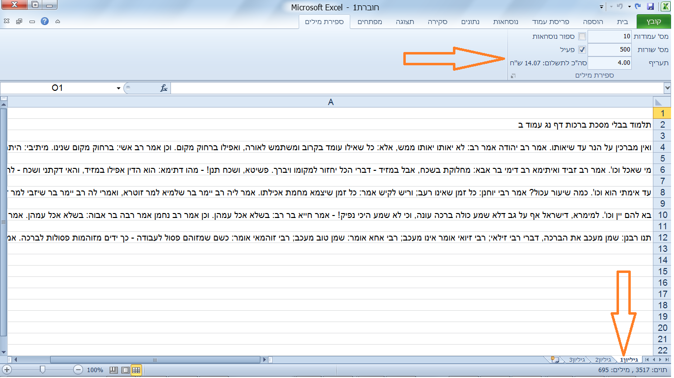 וגם יש אפשרות לקבל הודעה שמציגה את המספר הכולל של המילים והתווים בחוברת העבודה כולה.