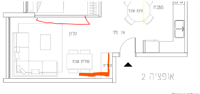 מצ"ב התשריט של הסלון מסומן הפינה של הספריה (השולחן והספות לא ממקומות כמו שרואים כאן)