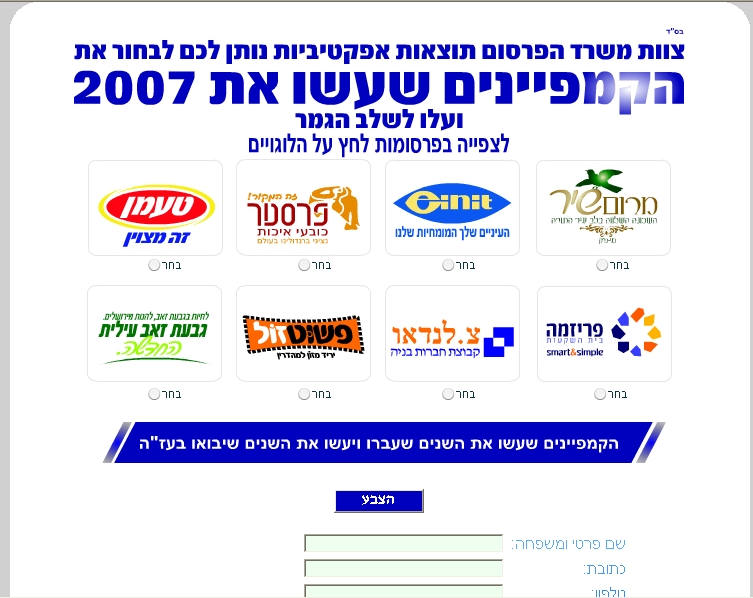 אני דירגתי. אני לא מבין גדול בפרסום אבל כשהבטתי בסקר חשבתי לעצמי איזה פרסומת זכורה לי הכי הרבה. (שזה אומר שגם אם היא פורסמה קצת אז היא חזקה). בחרתי את מרום שיר.