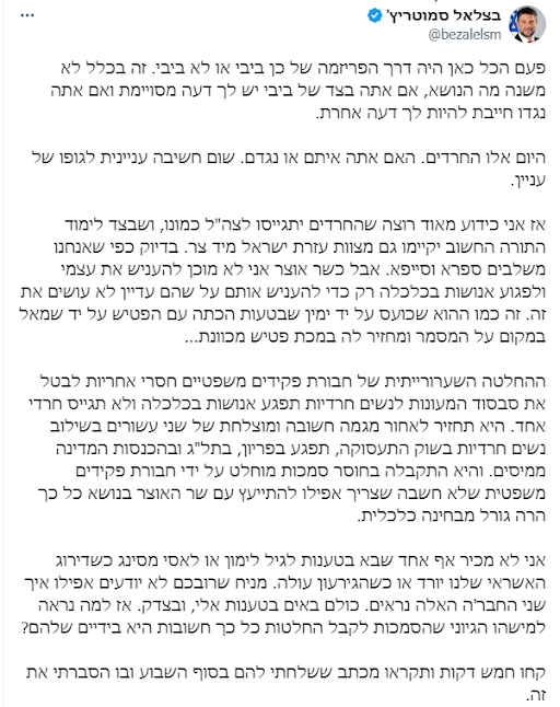 "סמוטריץ' עושה לנו נזק. זה מאכזב, אבל לא מפתיע", הוסיף הגורם הבכיר.