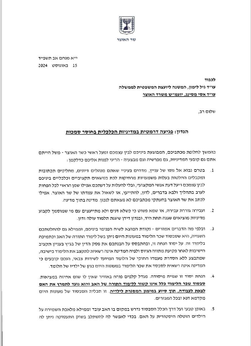 התנגשות משמעותית בסוגיית מעונות היום. סמוטריץ' שלח מכתב ארוך, מנומק היטב ועם ביקורת חריפה על גיל לימון ואסי מסינג ודורש מהם: