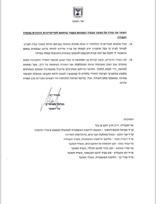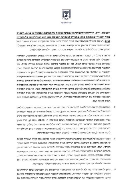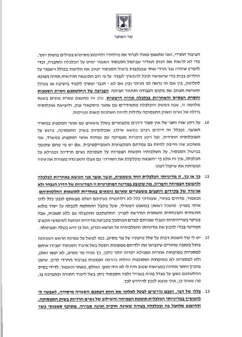"לבטל לאלתר את חוות דעתכם השגויה מיסודה, לאפשר לי להמשיך במדיניותי הכלכלית תומכת הצמיחה והשילוב של נשים חרדיות בשוק התעסוקה ולהימנע מלחבל בה ובכלכלה בצורה שאינה חוקית ואינה סבירה. מתוקף סמכותי האוצר אני מורה על המשך סבבסוד המעונות כאמור בהתאם לקריטריונים הנתונים במשרד העבודה".