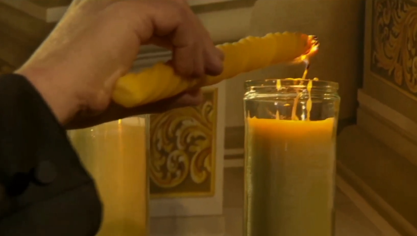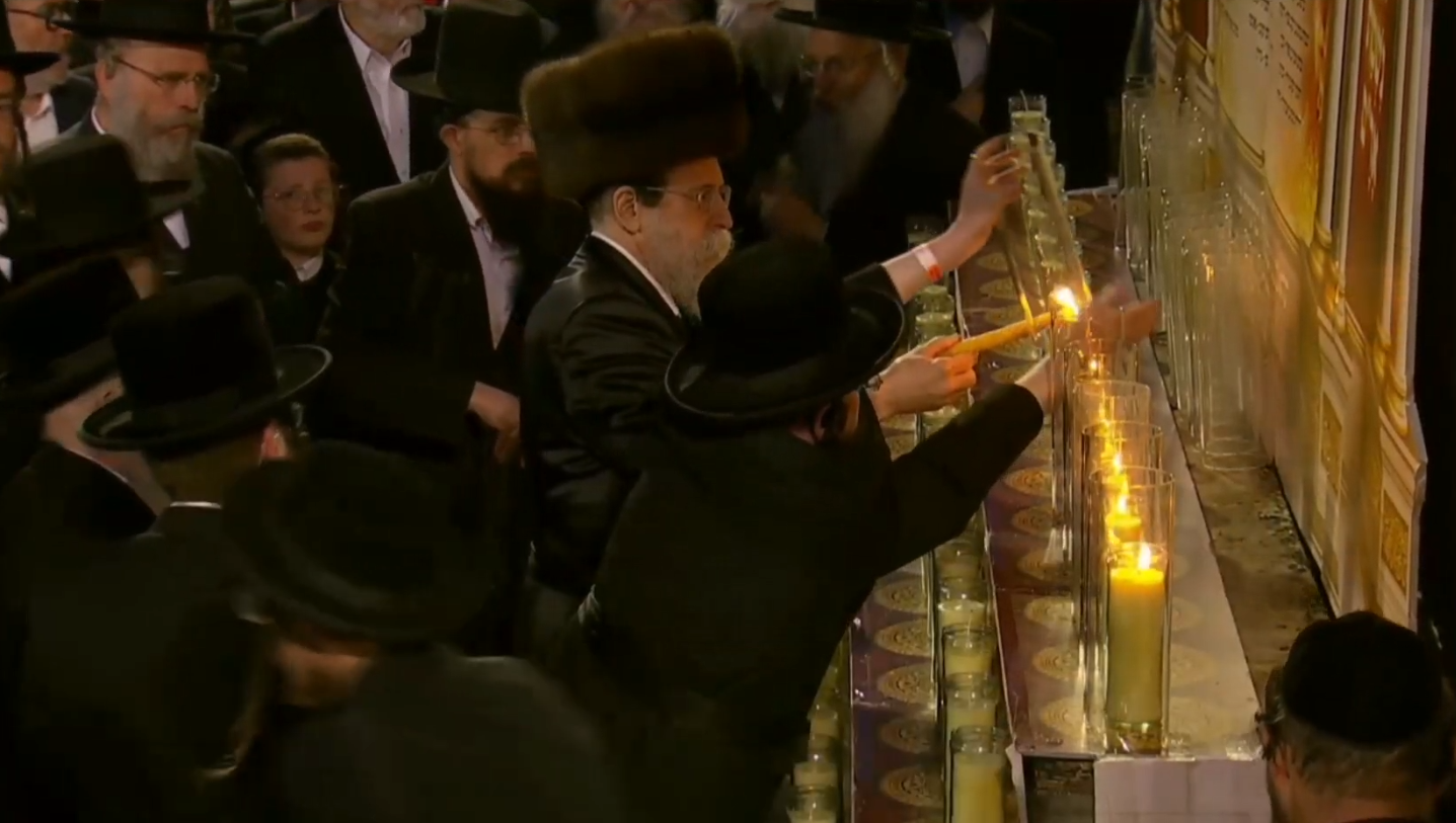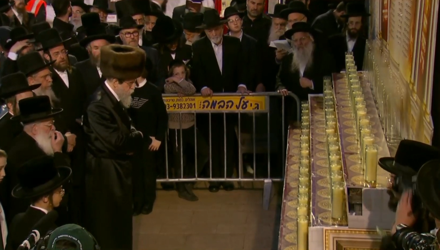 האדמו"ר עומד מהורהר מול 45 נרות נשמה.