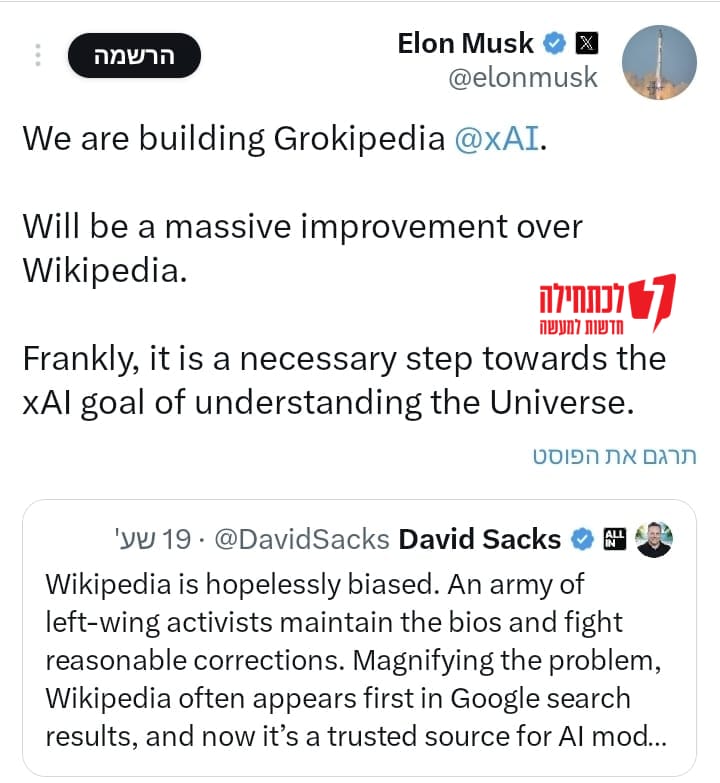 אילון מאסק חשף היום את פיתוחה של Grokipedia (גרוקפידיה) - פלטפורמה חדשה שתהווה לטענתו שדרוג משמעותי לויקיפדיה. ההכרזה מגיעה בתגובה לביקורת חריפה של דייוויד סאקס (יזם וסופר יהודי אמריקאי) על הטיות פוליטיות בוויקיפדיה, אותה תיאר כ"מכונת השמצות של השמאל". מאסק הבטיח כי הפרויקט, המבוסס על AI, יספק מידע נקי ומדויק יותר.