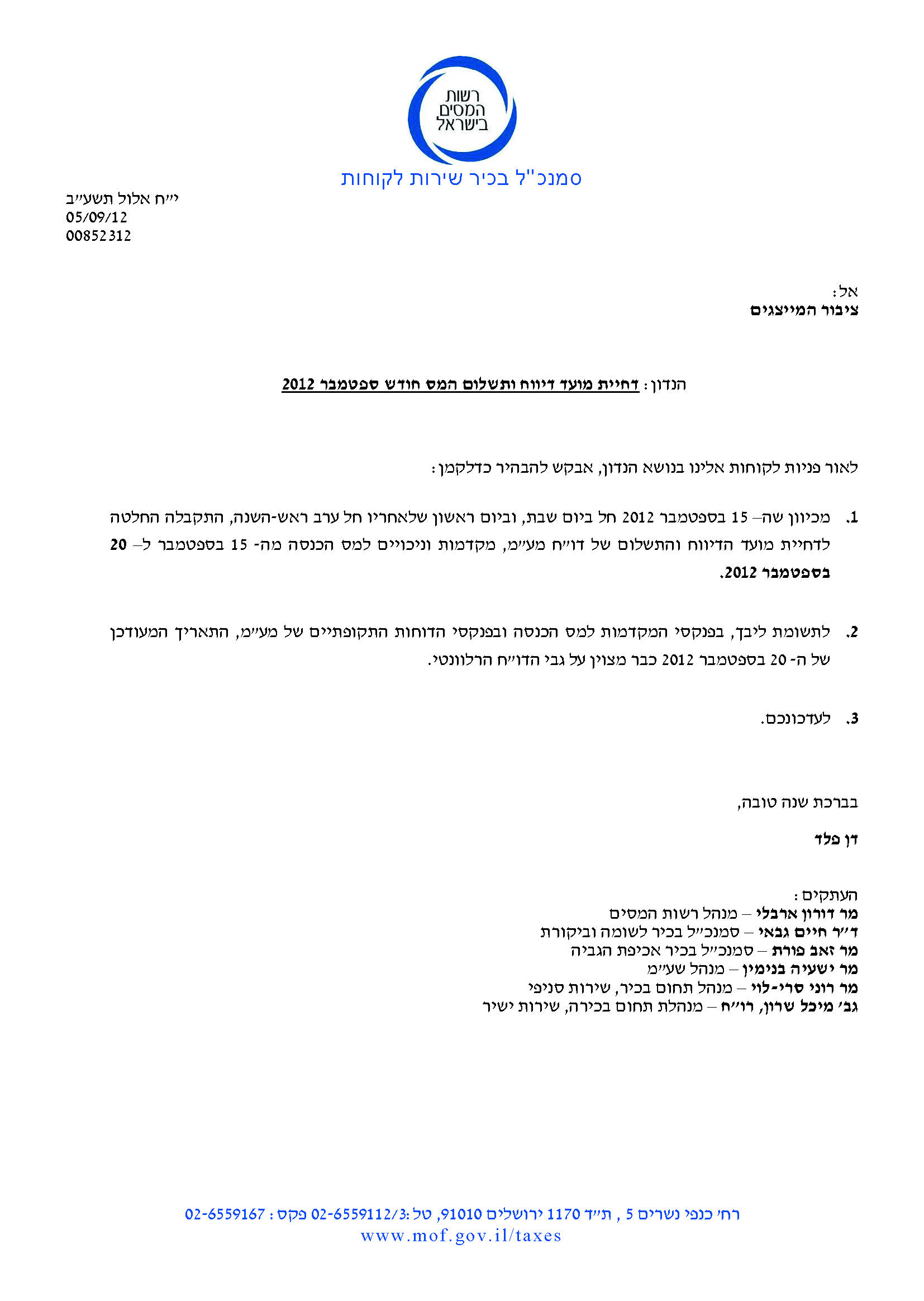 דחיית מועד דיווח ותשלום הדוחות התקופתיים עד 24.9.12