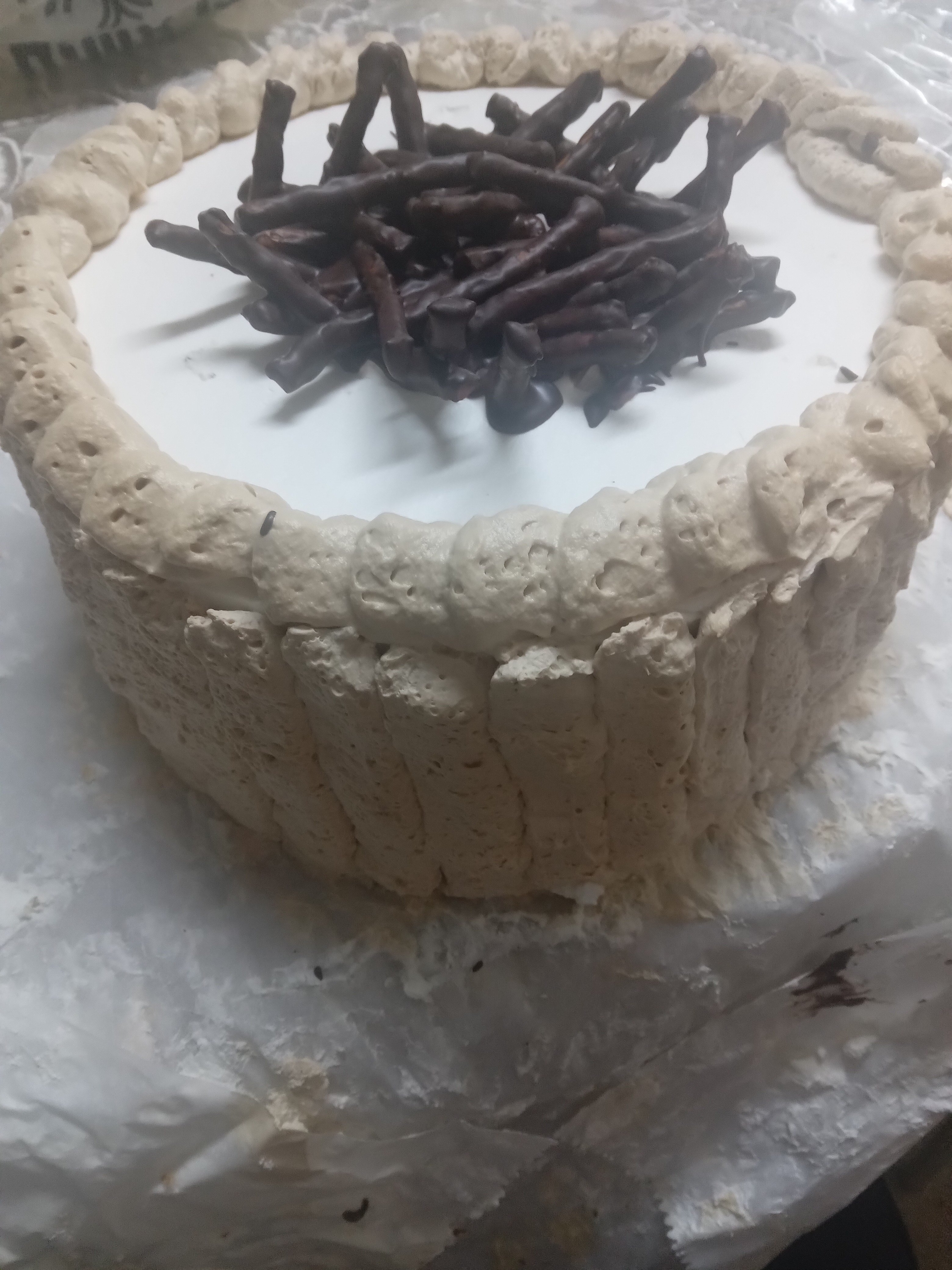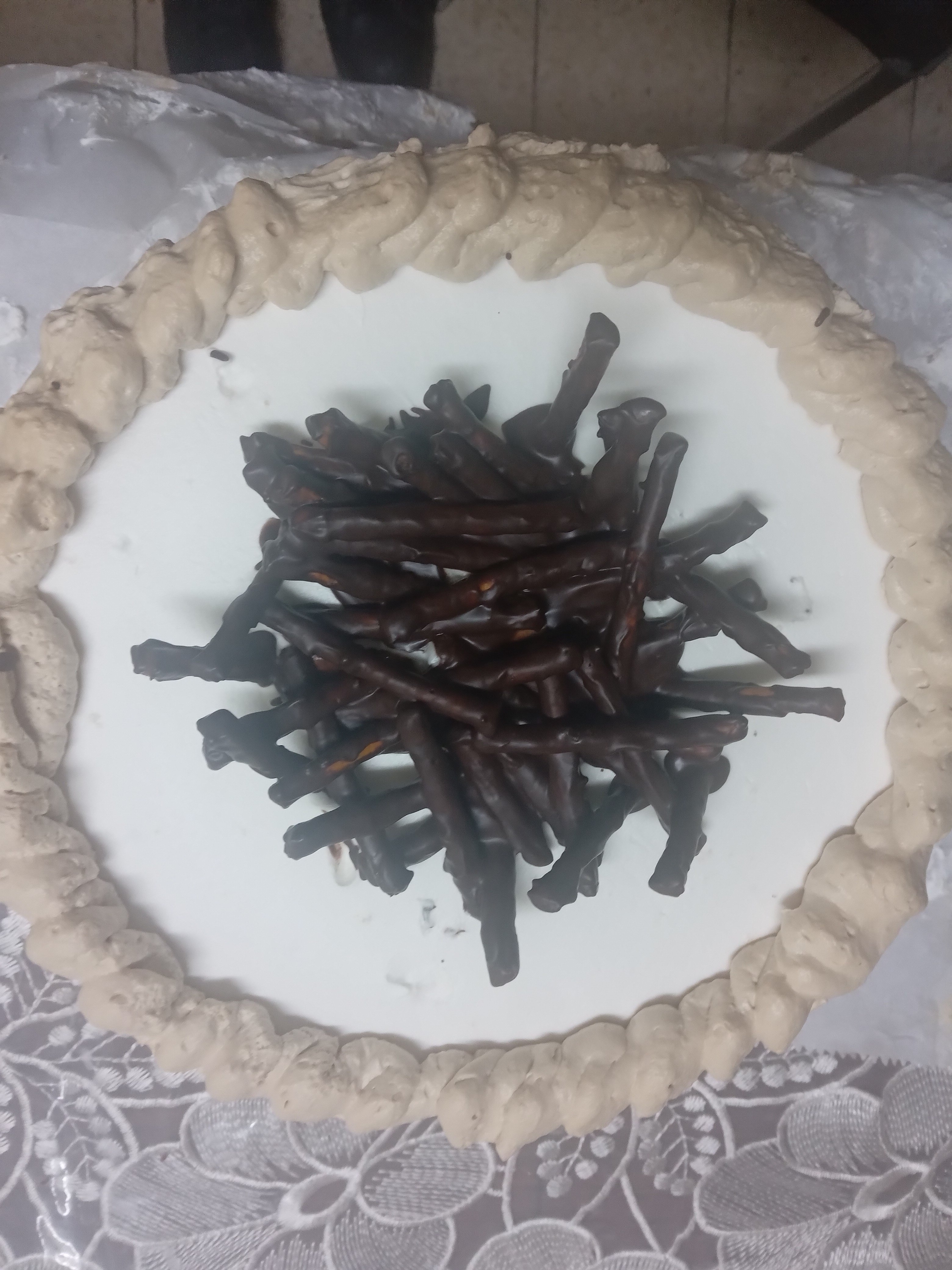 והוא חתך את העוגה אם מיכסה של סיר, ואת הקן, הוא קנה מקלות ביגלה וציפה שוקולד, ואז שם על העוגה!