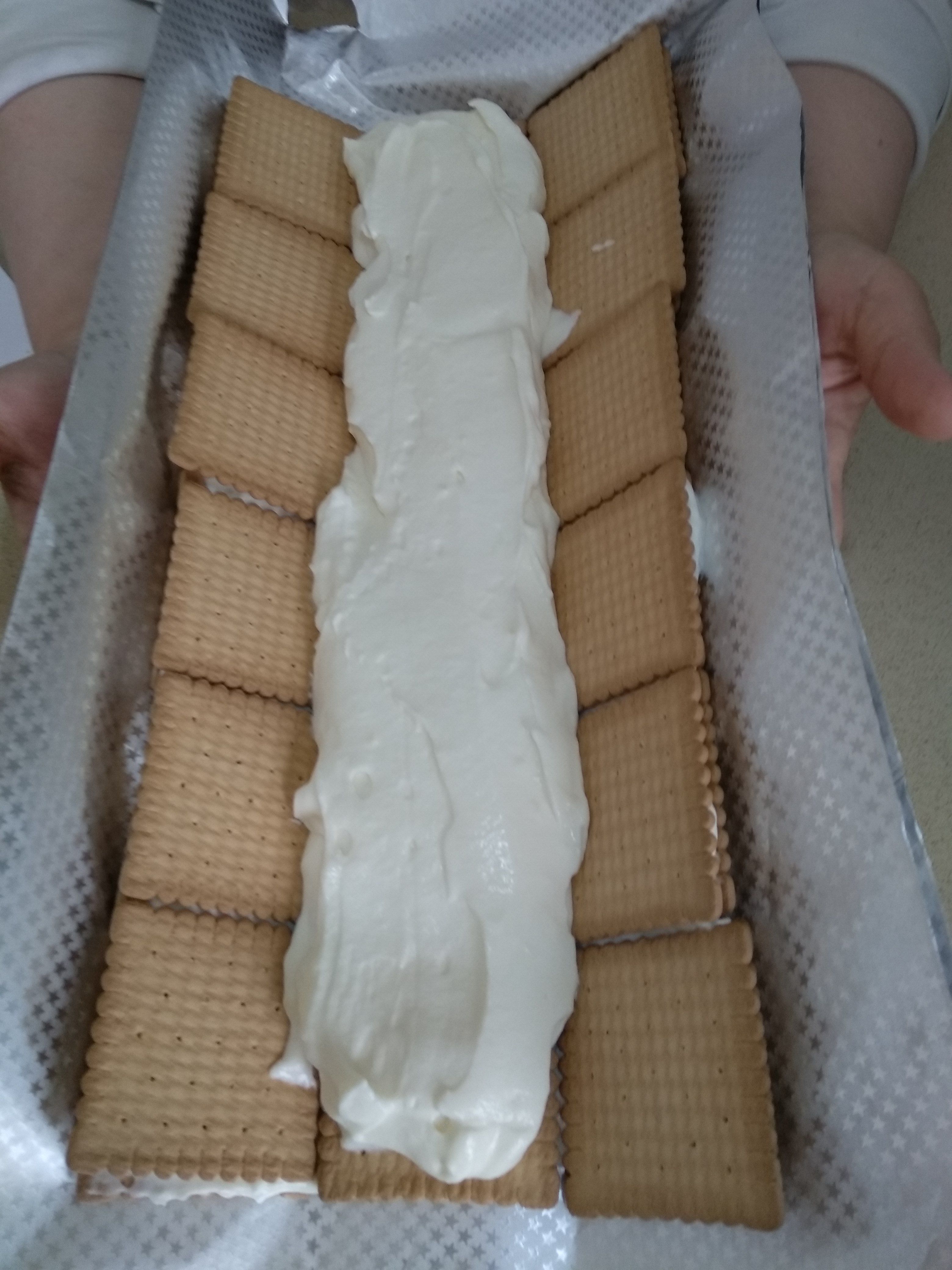 מניחים שוב 3 טורים של 5 או 6 בסקויטים טבולים בחלב והפעם מניחים בכפות גדושות את כל הקרם שנשאר, רק על הטור האמצעי.