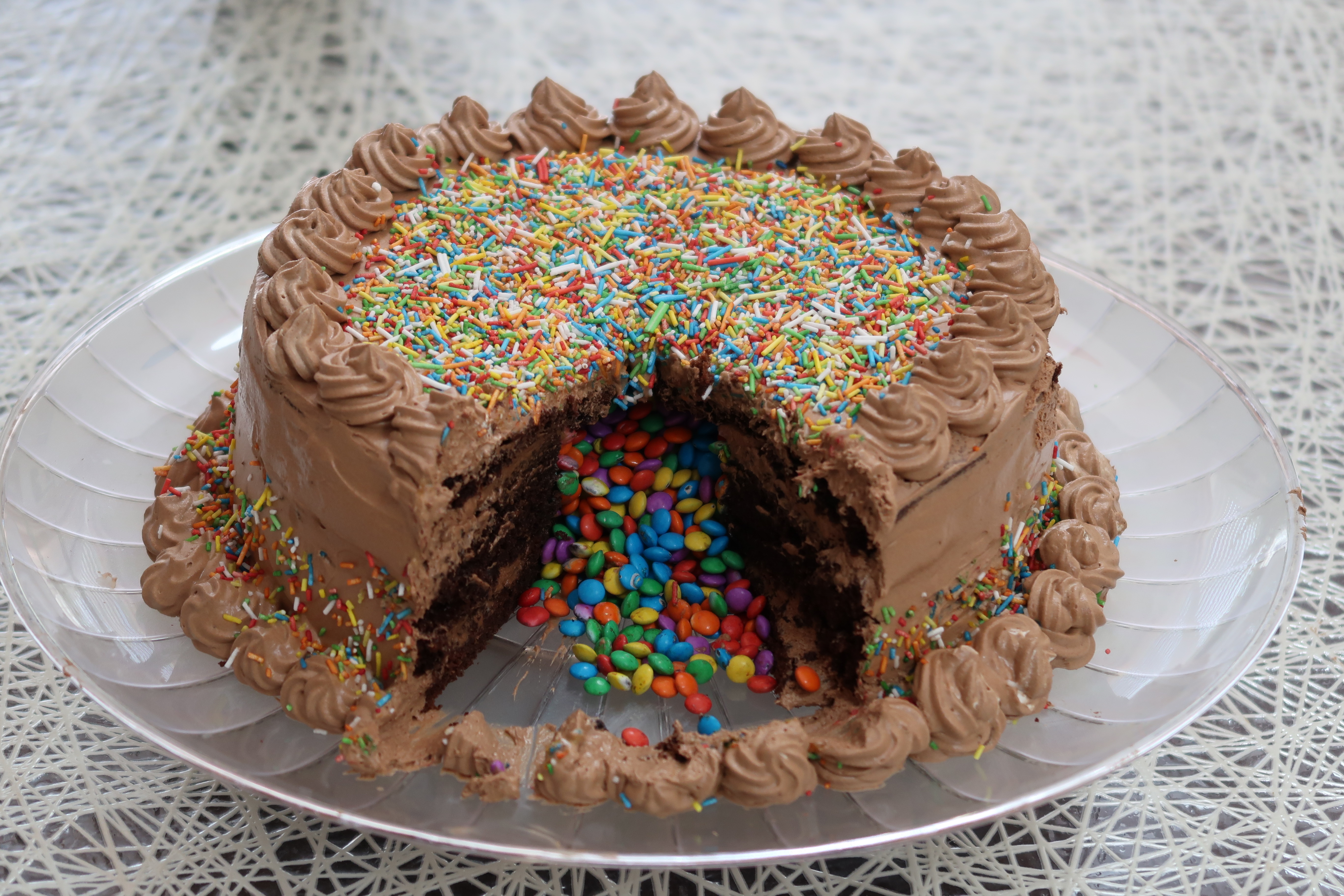 עוגת הפתעה. כשפותחים אותה נשפכים עדשים או כל ממתק אחר שתבחרי.