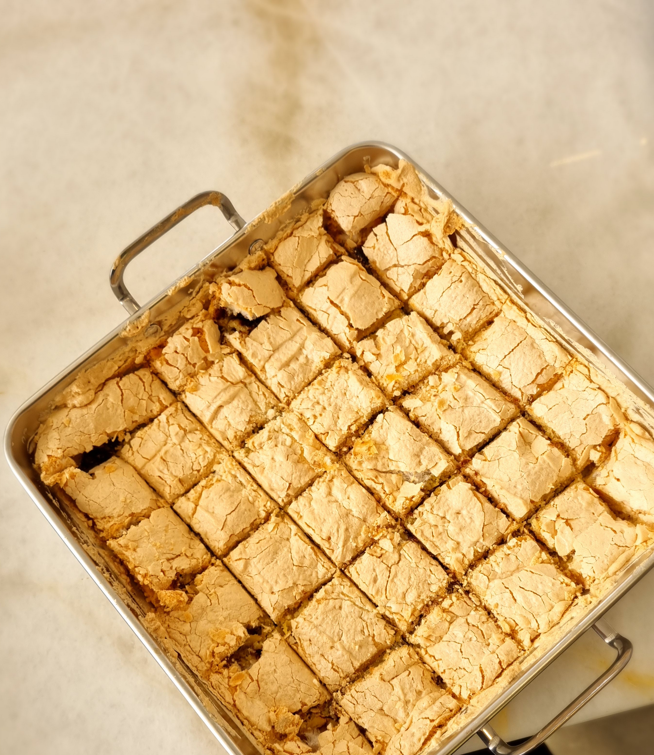 מעבירים את המרנג על שכבות הבצק-שוקולד, מורחים כך שהמרנג יכסה את כל שכבת הבצק העליונה.