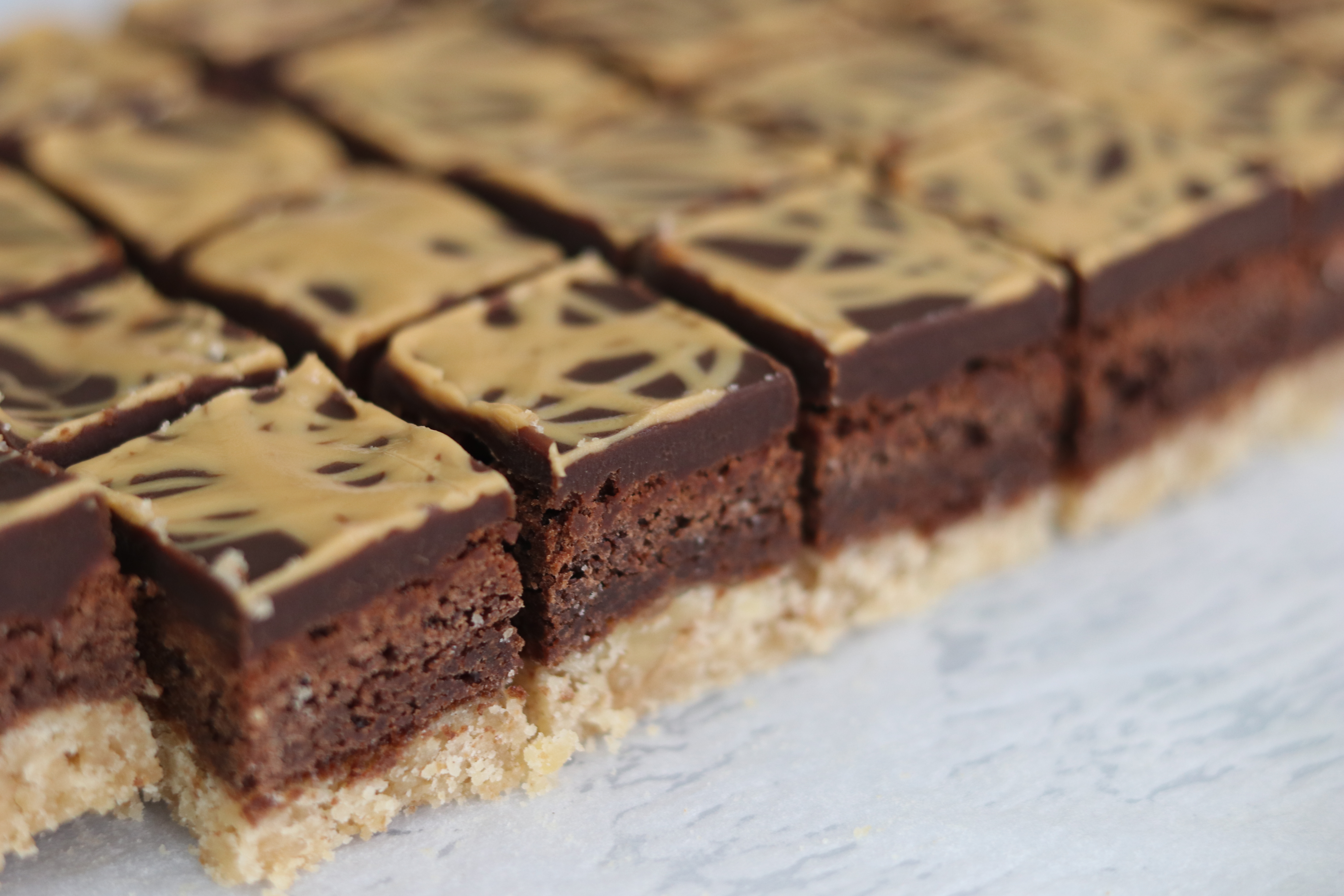 עוגת שלוש שכבות טעימה במיוחד. יש לה טעם מעודן עם נגיעות קפה וחמאת בוטנים או חלבה או נוגט או רק שוקולד.