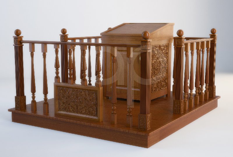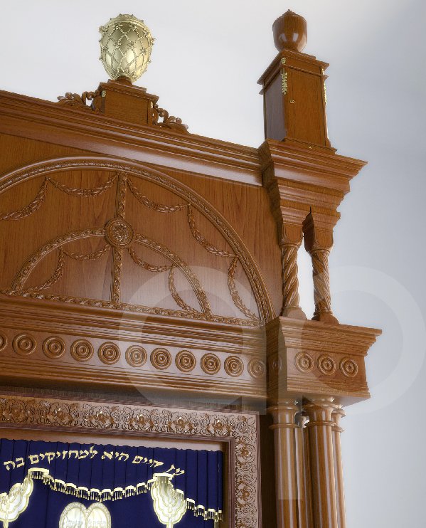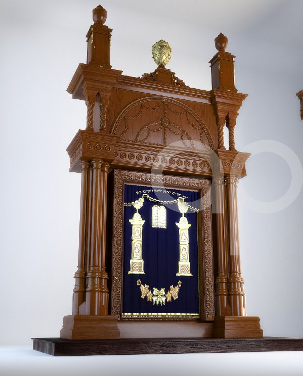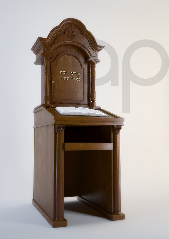 ב. עמוד של הש"ץ - 1. נראה שעמוק מידי, אישית לא ראיתי כזה עמוק,2 .ועוד נראה שהצד הימיני והשמאלי של גב העמוד אינו שוה, 3. ובד"כ אין מדף מתחת אלא מגירה 4. נלע"ד להגדיל את האותיות ושם השם יהיה באמצע וגדול יותר.5.לא ברור האם זהו דלת בגב העמוד, ואם כן למה?! 6. ואם אפשר הערה הלכתית - אם התמונה נדפסת שם השם יכול לבוא לביזיון.