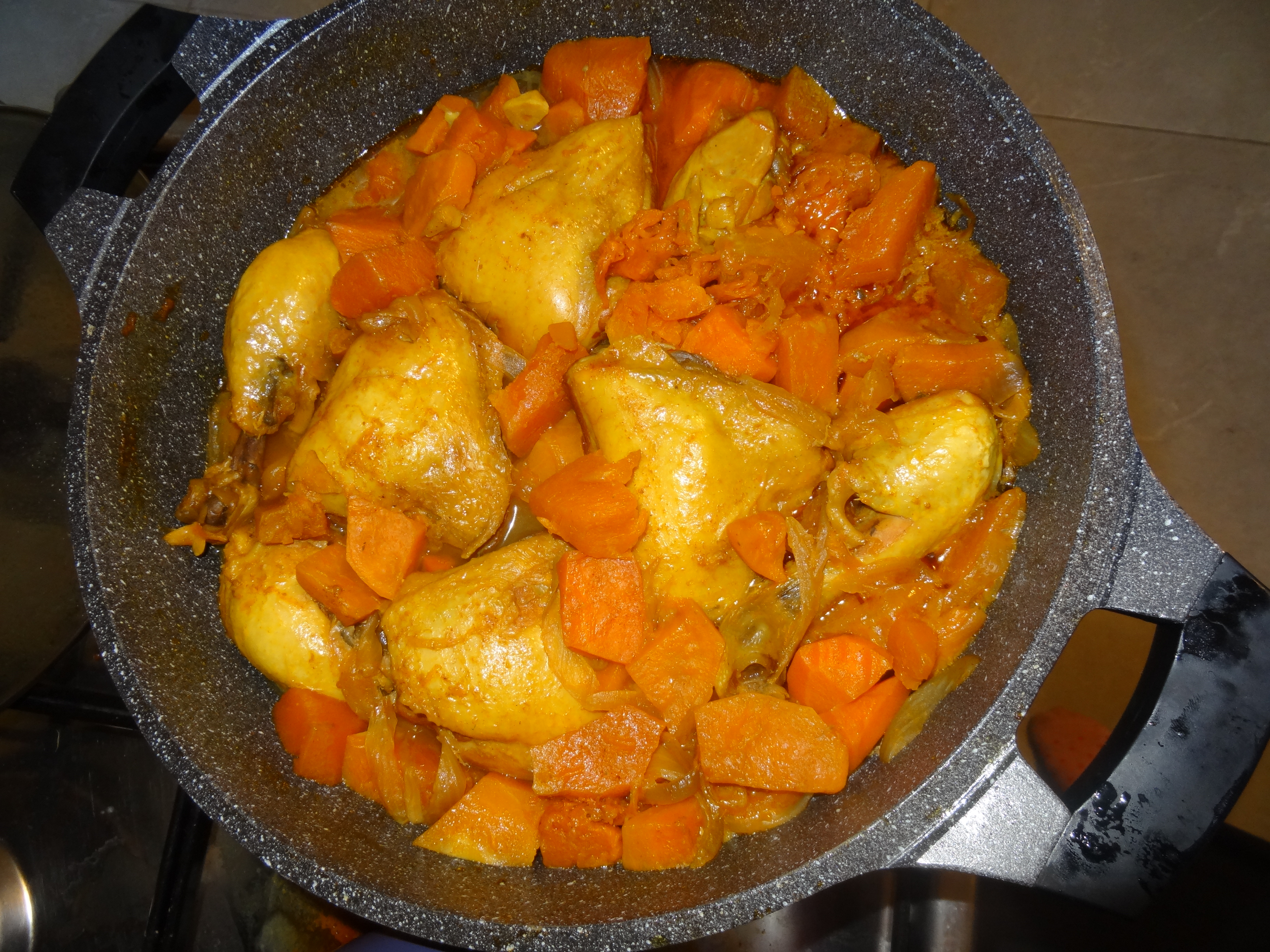 מביאים לרתיחה, לכסות ולבשל על אש הכי קטנה כשעה וחצי-שעתיים או עד שהעוף רך מאוד.